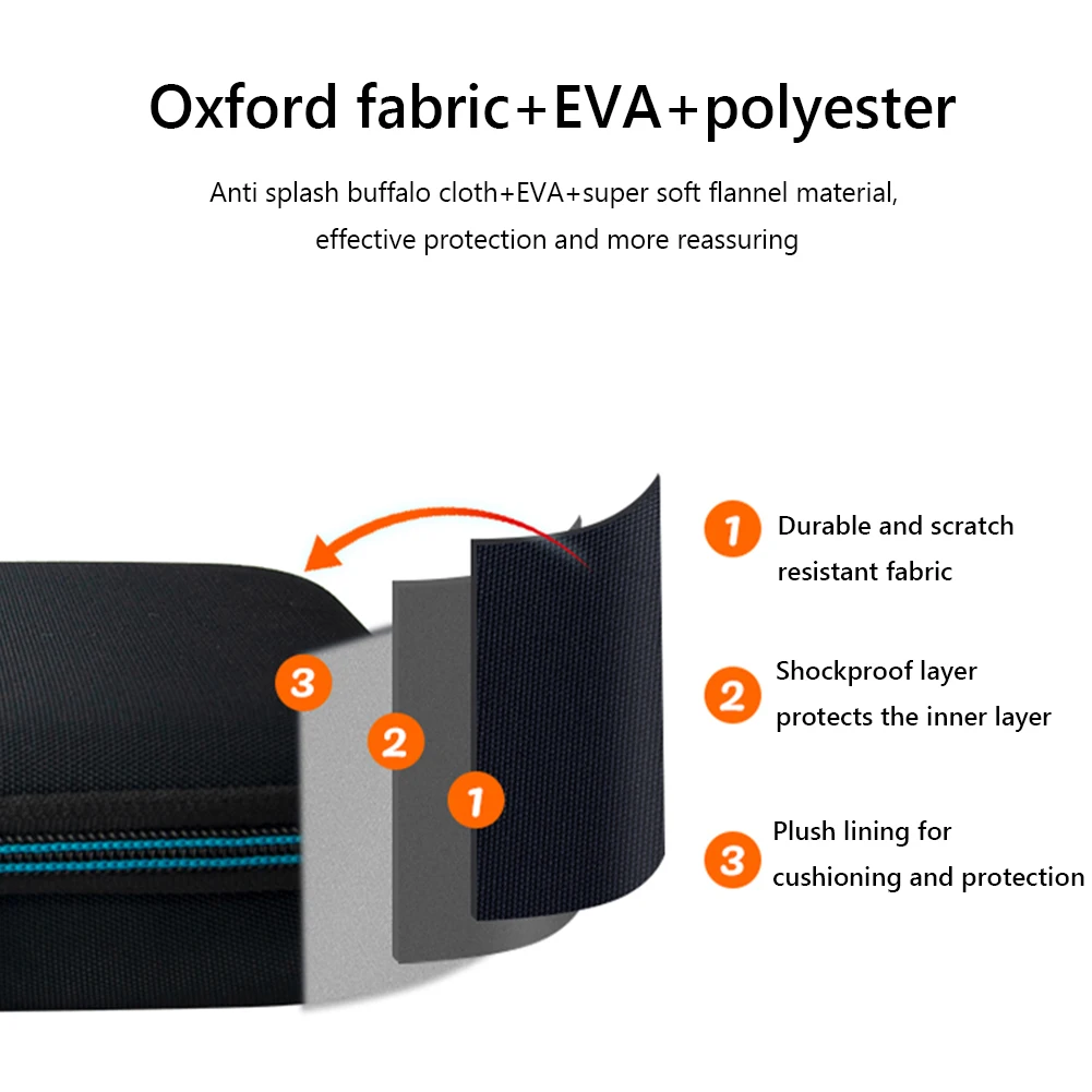 2. Material de alta calidad:Tela Oxford + EVA + material de poliéster, protege y tranquiliza eficazmente. Carcasa dura de EVA reductora de presión y a prueba de golpes, resistente al desgaste y resistente a los arañazos, con terciopelo suave en el interior para proteger los objetos internos de daños.