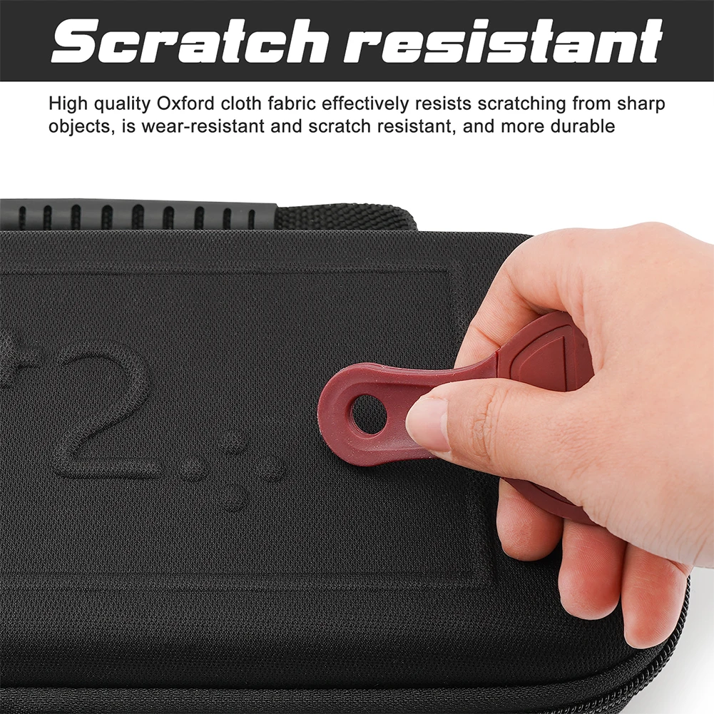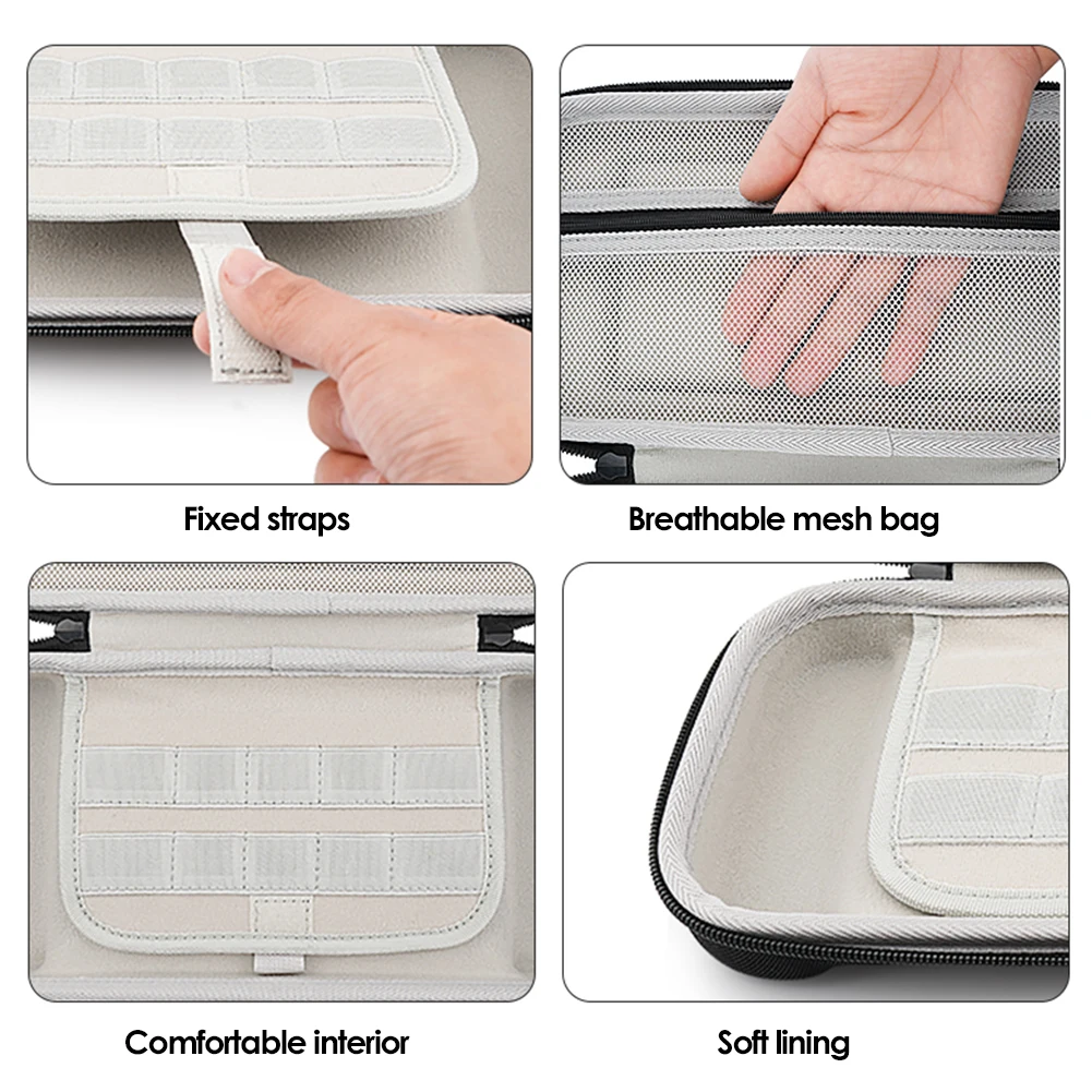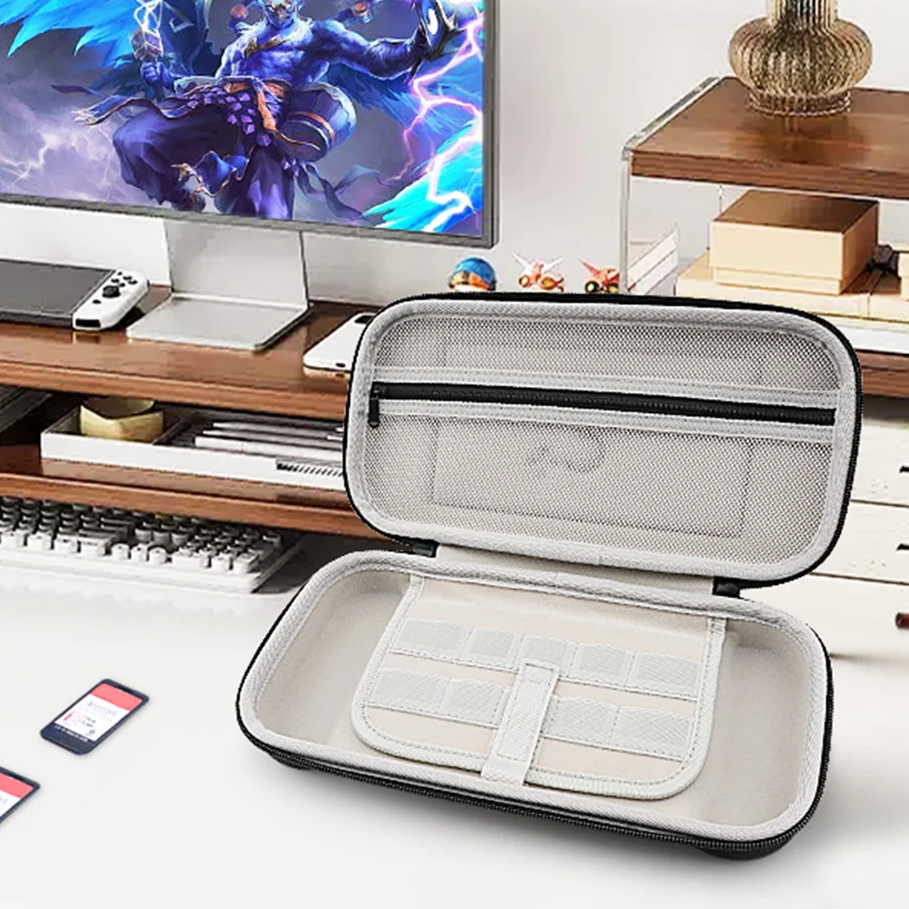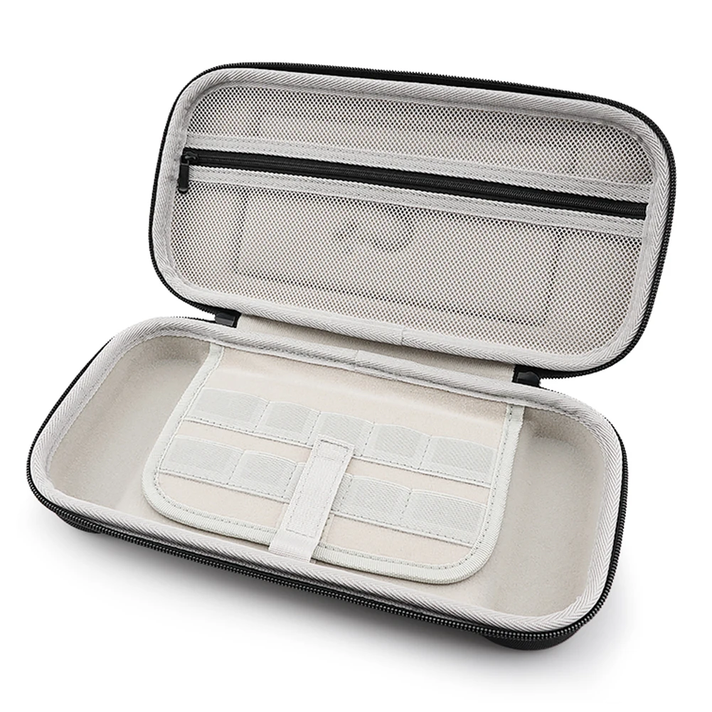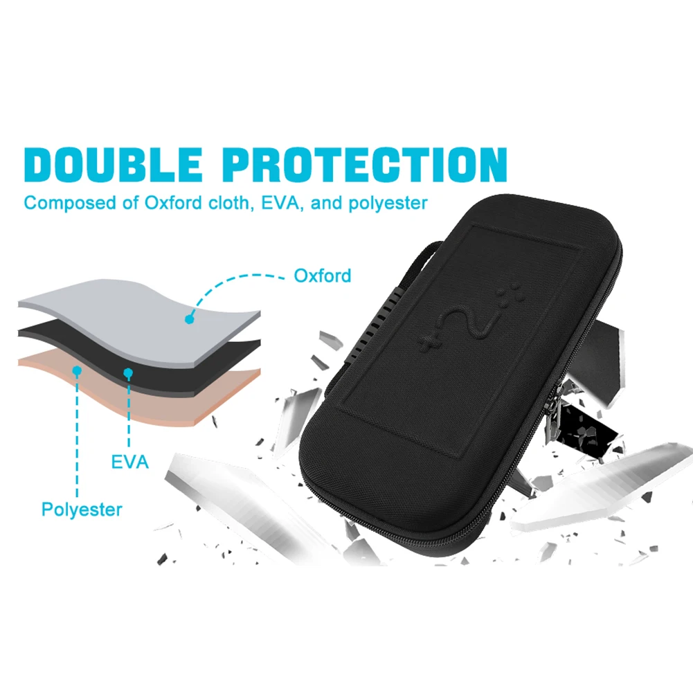 1.Protección superior contra la carcasa dura:Fabricada con EVA de una sola pieza, esta bolsa de almacenamiento portátil ofrece una resistencia excepcional a los golpes y al aplastamiento, protegiendo su consola de juegos portátil y su equipo digital durante el transporte.
