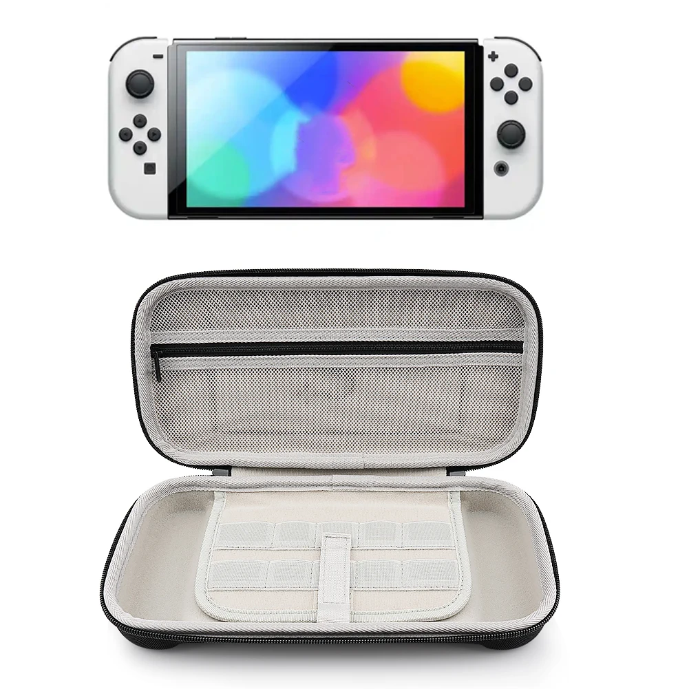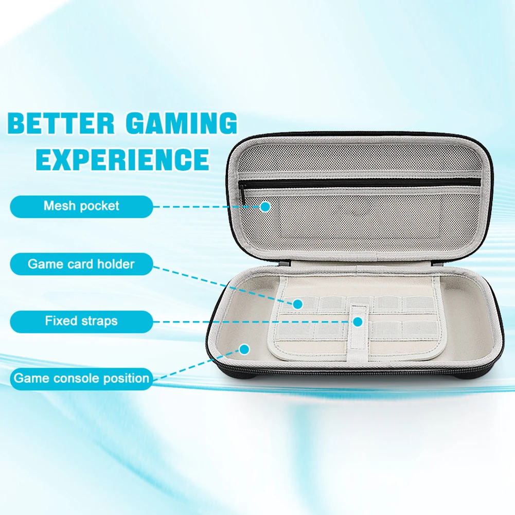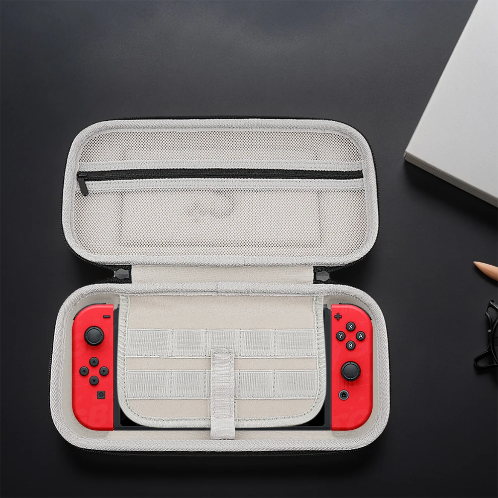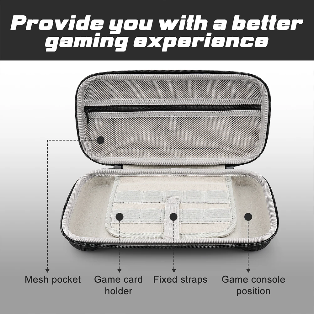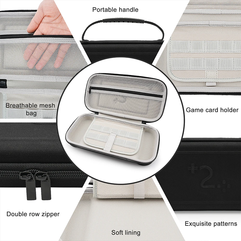 1.Protección superior contra la carcasa dura:Fabricada con EVA de una sola pieza, esta bolsa de almacenamiento portátil ofrece una resistencia excepcional a los golpes y al aplastamiento, protegiendo su consola de juegos portátil y su equipo digital durante el transporte.