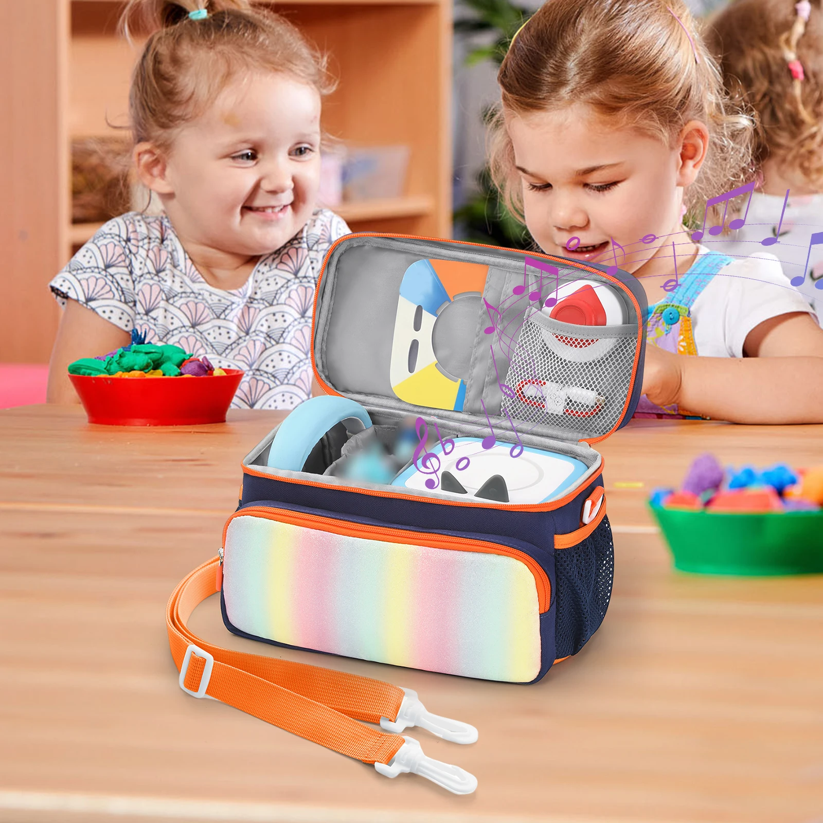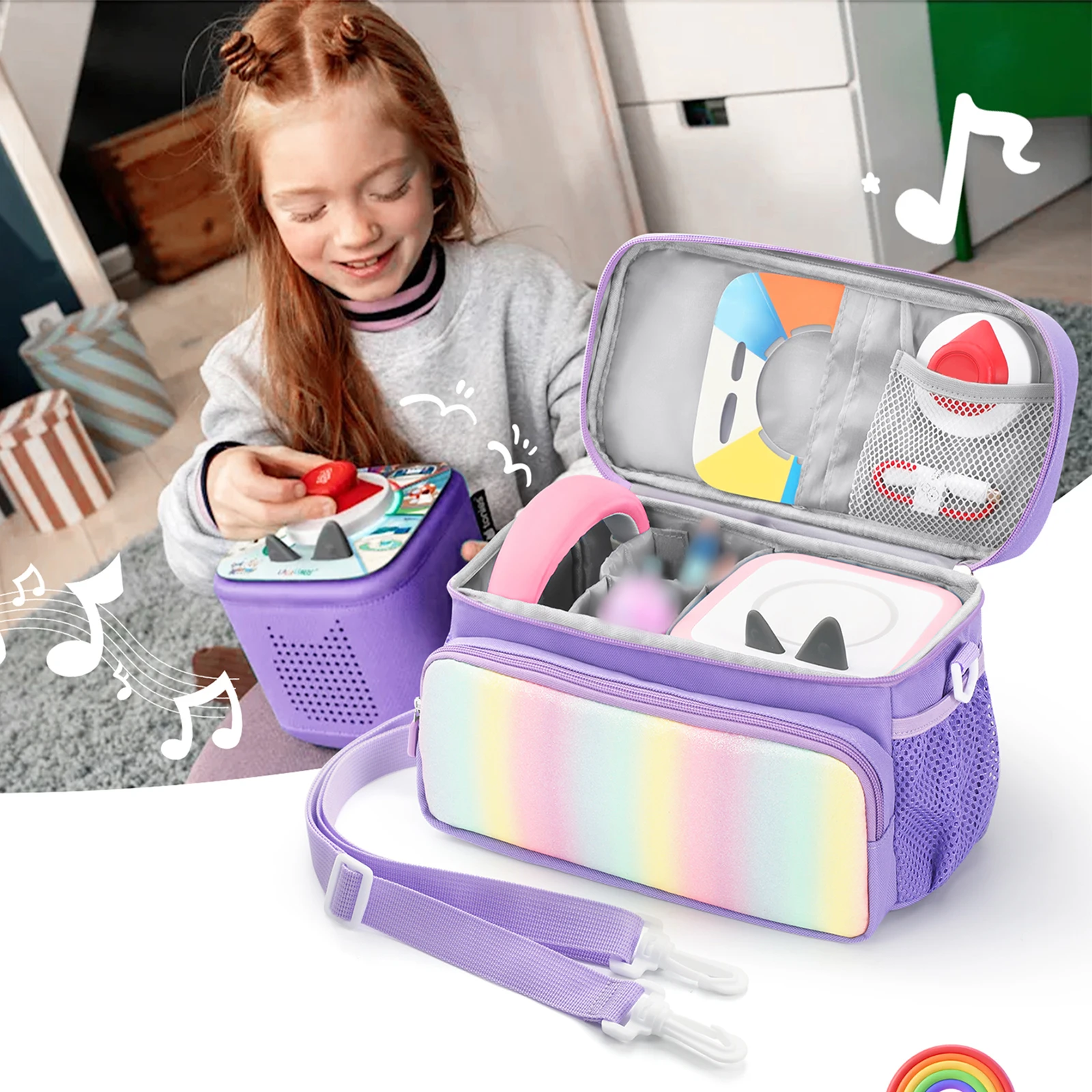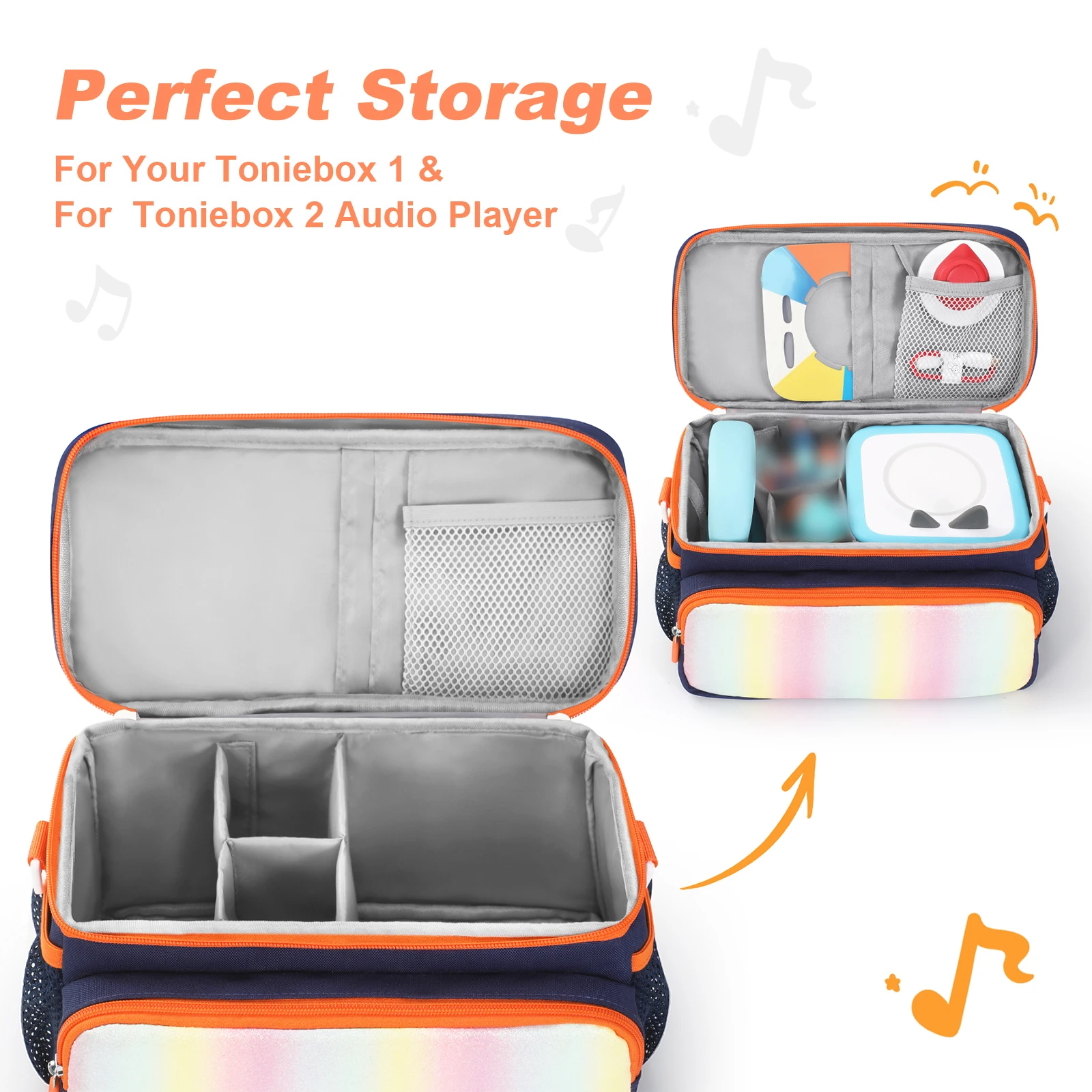 2. Múltiples bolsillos de almacenamiento:Diseñada con bolsillos superiores y frontales compatibles con las figuras Toniebox*, esta bolsa para guardar auriculares proporciona el gran espacio para exhibir su colección.El bolsillo de malla con cremallera en la parte delantera es ideal para guardar cables de carga de forma segura.