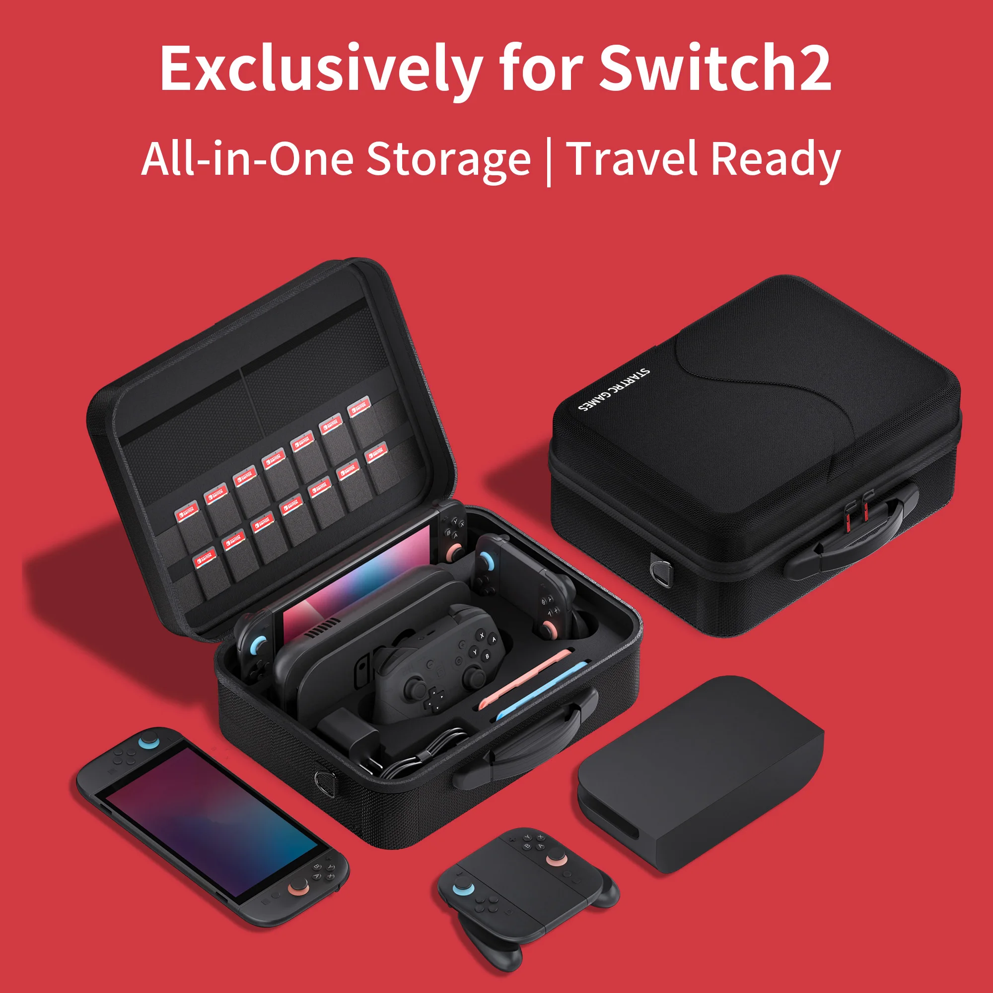 Todo está en su lugar: almacene y transporte de forma segura su consola para Switch 2, controlador para Pro, Joy-Cons, Dock para TV, muñequeras y hasta 18 cartuchos para juegos.Todo lo que necesitas para jugar mientras viajas está perfectamente organizado y listo para viajar.