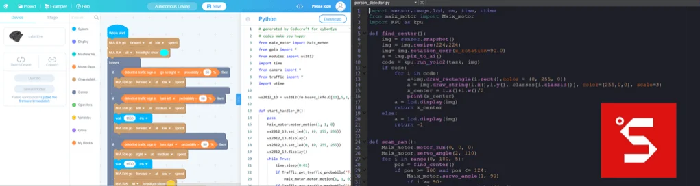 Codecraft es un software de programación gráfica basado en Scratch 3.0, desarrollado por nosotros que está disponible en escritorio y en el navegador.Codecraft admitirá las funciones MARK AI en códigos de arrastre y caída, además de permitirle ver cómo se verá el código MicroPython.Simplemente conéctese y luego haga clic en cargar para comenzar a usar su MARCA con su programa editado.Si está seguro de sus habilidades de codificación, también puede seguir adelante y editar el código Python basado en texto en Codecraft.Incluso puedes utilizar tus propios modelos personalizados a través de Codecraft.