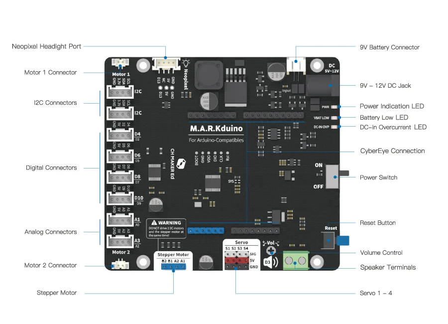 Se incluyen motores paso a paso y servoportes de repuesto que puede utilizar para extender MARCA como robot con una funcionalidad de agarrador o transportador.El Markduino también incluye puertos digitales, analógicos e I2C de repuesto, en los que puedes conectar y reproducir fácilmente algunos sensores compatibles de la serie Grove.Leer más sobre grove aquí.Aquellos familiares con Arduinos notarán que la distribución de pines markduino encaja, por lo que los proyectos también se pueden implementar con este controlador.