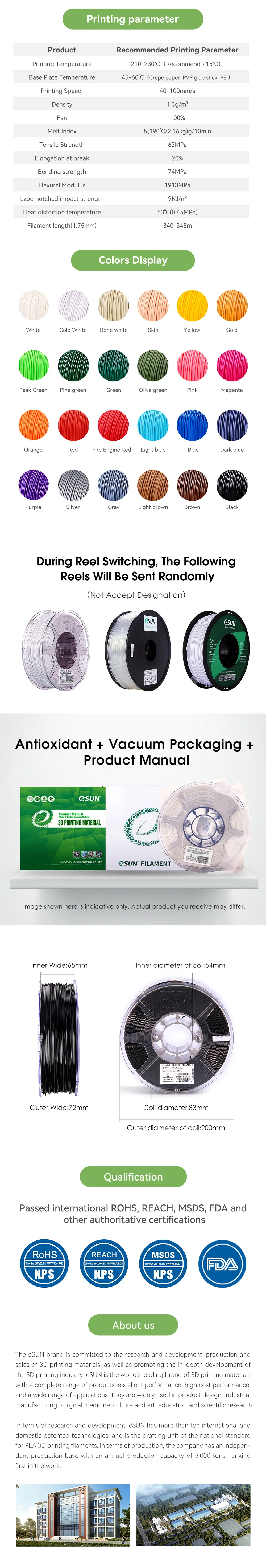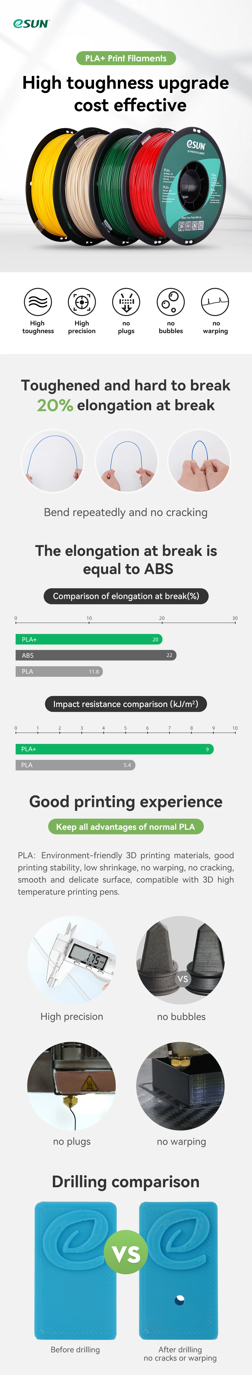 【Tolerancia dimensional +/-0,03 mm】Tolerancia mínima y baja deformación para garantizar una alimentación consistente e impresiones estables, sin obstrucciones, tasa de éxito extremadamente alta, lo que resulta en piezas impresas que tienen un acabado superficial excepcional y son altamente precisas.【Sin enredos y sin taponamiento】Longitud total: 340-350m. Carrete de filamento de impresora 3D de 1kg, redondez perfecta y tolerancia de diámetro muy ajustada, no se superpone ni se enreda. Se funde bien, alimenta suavemente y constantemente sin obstruir la boquilla o el extrusor.【Material respetuoso con el medioambiente】PLA + está mejorado y actualizado basado en PLA, alta resistencia y mejor dureza. Los filamentos eSUN están hechos con materiales vírgenes, biodegradables y ecológicos, no tóxicos y con poco olor, NO dañan al usuario ni al medio ambiente.【Alta compatibilidad】Compatible con la mayoría de las impresoras 3D FDM que utilizan filamentos de 1,75 MM, como: Prusa, Reprap, Afinia, MakerBot, PrintrBot, UltiMaker, Airwolf, Aleph Objects, Makergear, Up, Lulzbot, simplify3D, Flashforge, etc.【Embalaje sellado al vacío 】Peso neto: 1Kg. El filamento eSUN viene en una bolsa de vacío sellada con una bolsa desecante para mantenerlo seco y evitar la entrada de polvo y partículas extrañas, evitar atascos de boquillas y producir modelos 3D suaves.