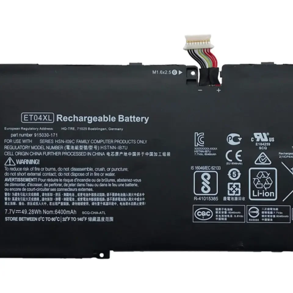 Modelo No. ET04XL Lugar de origen China Voltaje 7,7 V Capacidad 49.81WH Tipo Batería de iones de litio Recargable Sí Grado celular Grado A Garantía 13 meses Condición 100% nuevo Ciclos de vida (tiempos) 500-800 Plazo de entrega 3-10 días Certificado FCC CE UL MSDS RoHS N. ° de pieza compatible (batería) ET04XL 915030-1C1 915191-855, ET04049XL, 1-, 1. Moldes para portátiles Cuaderno HP EliteBook X360 1020 G2 de la serie.
