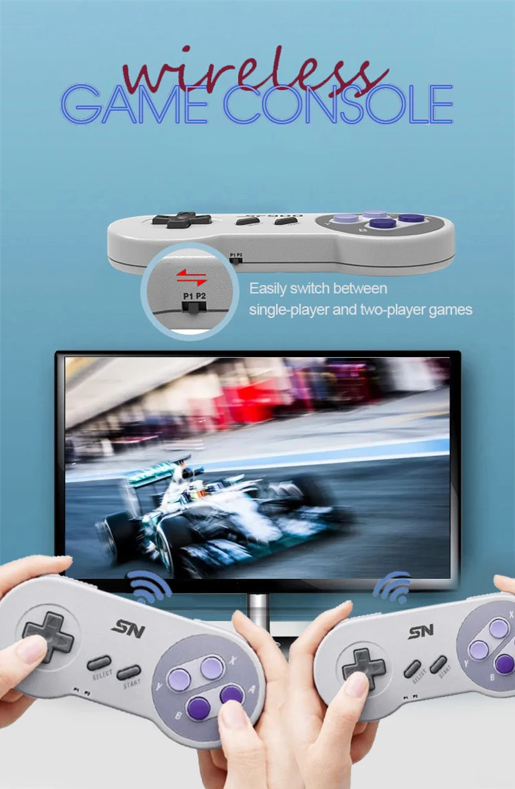 Equipado con dos controladores de juego inalámbricos. Admite hasta 2 jugadores al mismo tiempo, puede controlar y disfrutar del juego de forma remota en el sofá con su familia o amigos