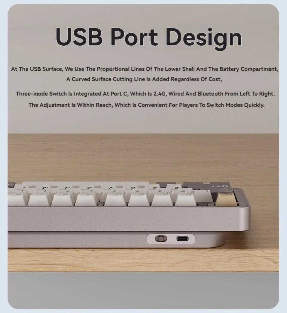 3.En el diseño del puerto SB, agregamos una línea de corte de superficie curva sin costo utilizando las líneas de igual proporción entre la caja inferior y el compartimiento de la batería en el puerto USB, e integramos un interruptor de tres modos en el puerto C, que Tiene tres marchas de izquierda a derecha, es decir, 2.4G, cableado y Bluetooth.El ajuste está al alcance de su mano, lo que facilita que los jugadores cambien de modo rápidamente.