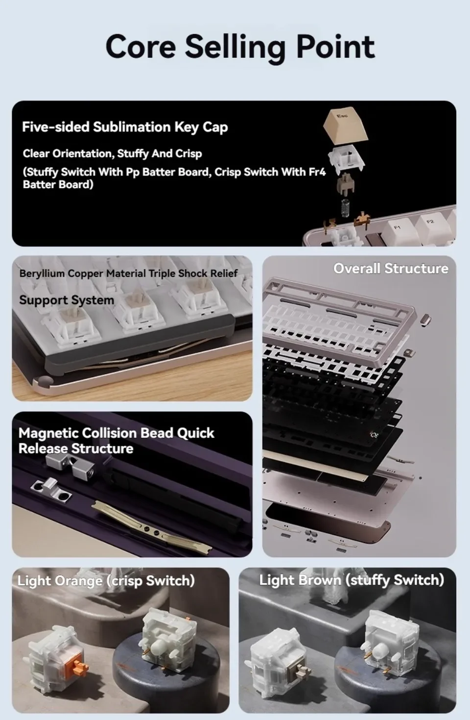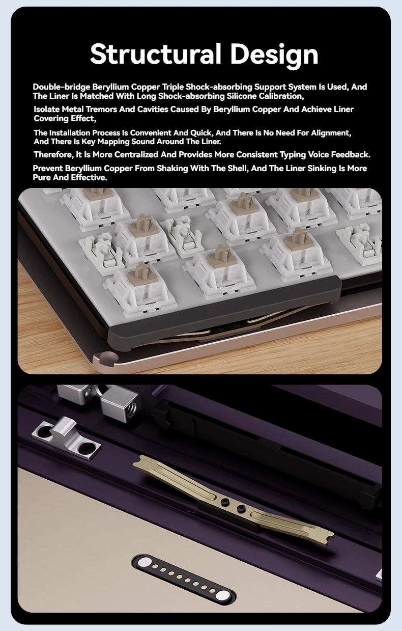 2.Diseño estructural, se utiliza el sistema de soporte de doble puente de cobre y triple amortiguación, y el revestimiento se combina con gel de sílice de amortiguación larga, que aísla los temblores metálicos y la cavidad causadas por el cobre berilio y logra el efecto de recubrimiento del revestimiento.El proceso de instalación es conveniente y rápido sin contrapunto, y los sonidos de las teclas alrededor del revestimiento están más concentrados, lo que proporciona una respuesta de sonido de escritura más consistente.Se evita la vibración entre el cobre berilio y la cáscara, y el hundimiento del recipiente interior es más puro y eficaz.