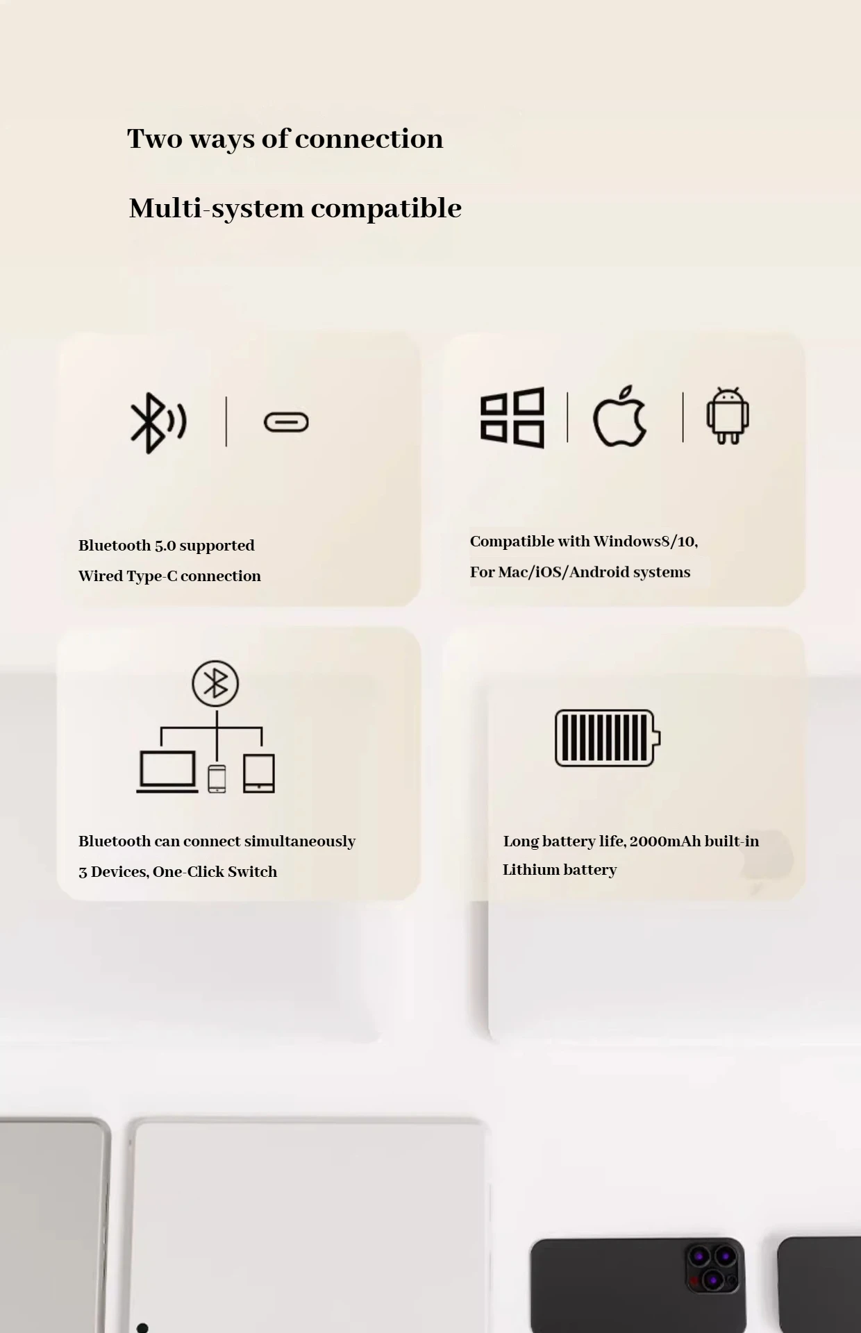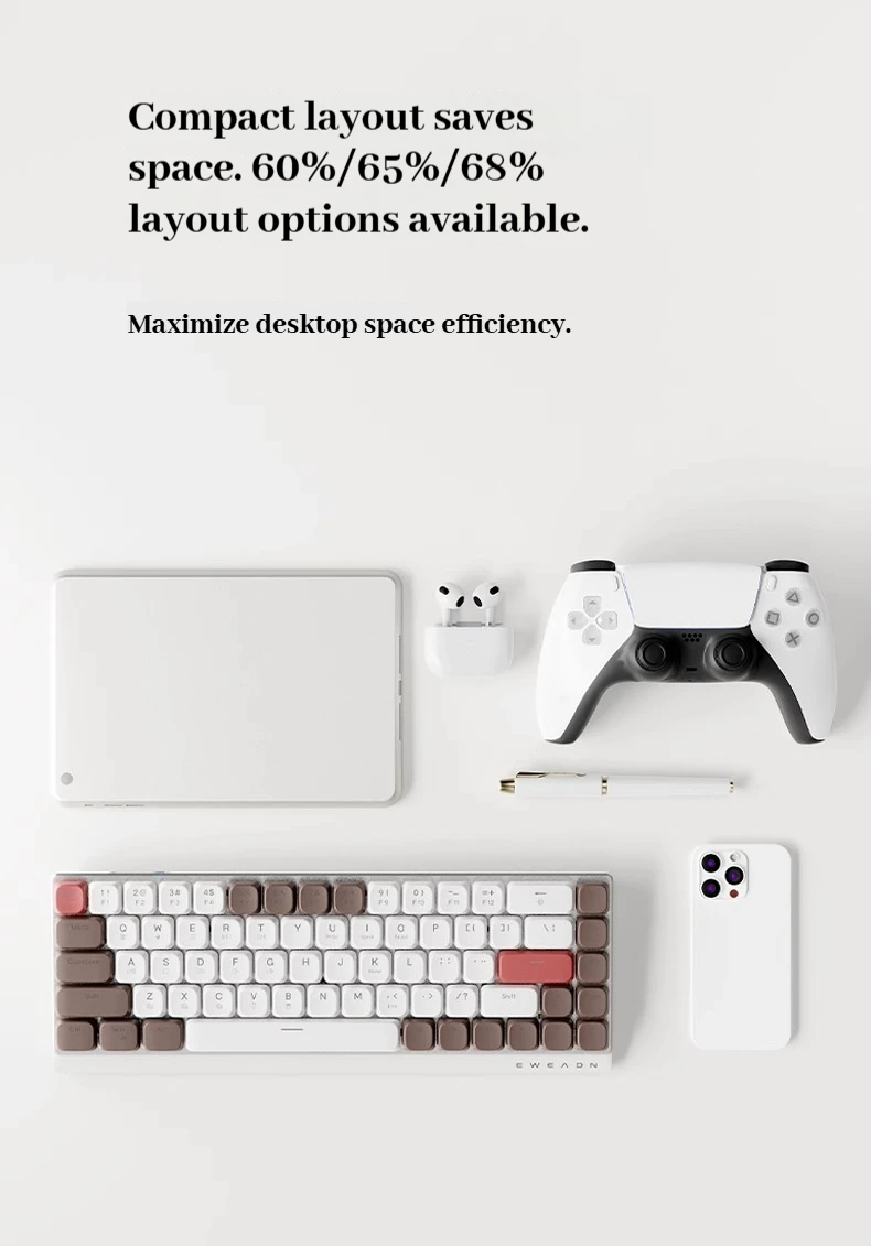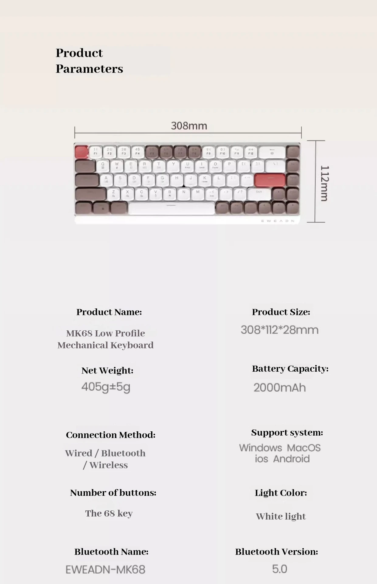 Nombre del producto: Teclado mecánico MK68 de bajo eje Tamaño del producto: 308*112*28mm Peso neto del producto: 405g ± 5g Capacidad de la batería: 2000 mAh Método de conexión: cableado/Bluetooth/inalámbrico Sistemas compatibles: Windows, MacOS, iOS, Android Número de llaves: 68 Color de luz: luz blanca Nombre de Bluetooth: EWEADN-MK68 Versión de Bluetooth: 5.0