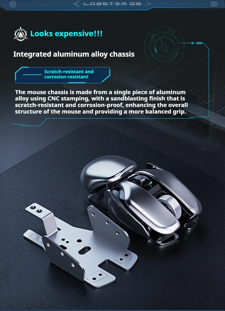 El chasis del mouse está impreso por CNC a partir de una sola pieza de aleación de aluminio.El acabado pulido con chorro de arena lo hace resistente a los rayones y a la corrosión, fortaleciendo aún más la estructura general del mouse y proporcionando un agarre más equilibrado.