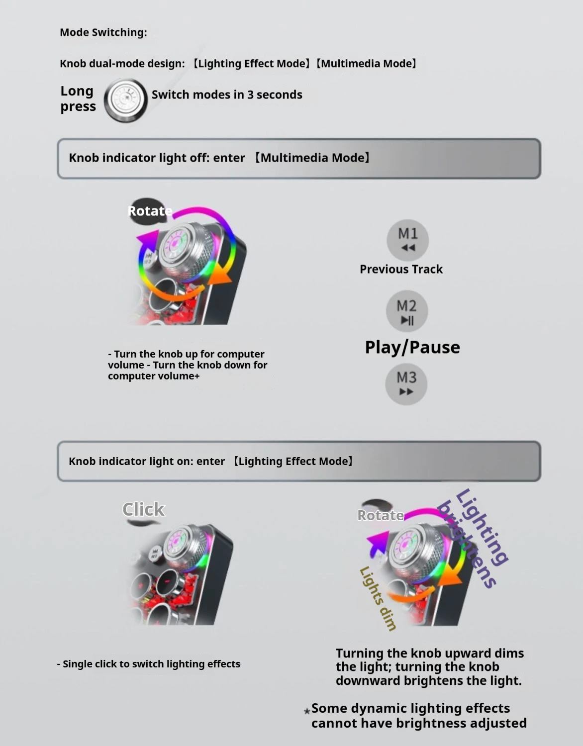 [Modo de iluminación]: haga un solo clic para cambiar los efectos de iluminación y gire la perilla para iluminar/atenuar la luz. Nota: Algunos efectos de iluminación dinámicos no se pueden ajustar en cuanto a brillo.