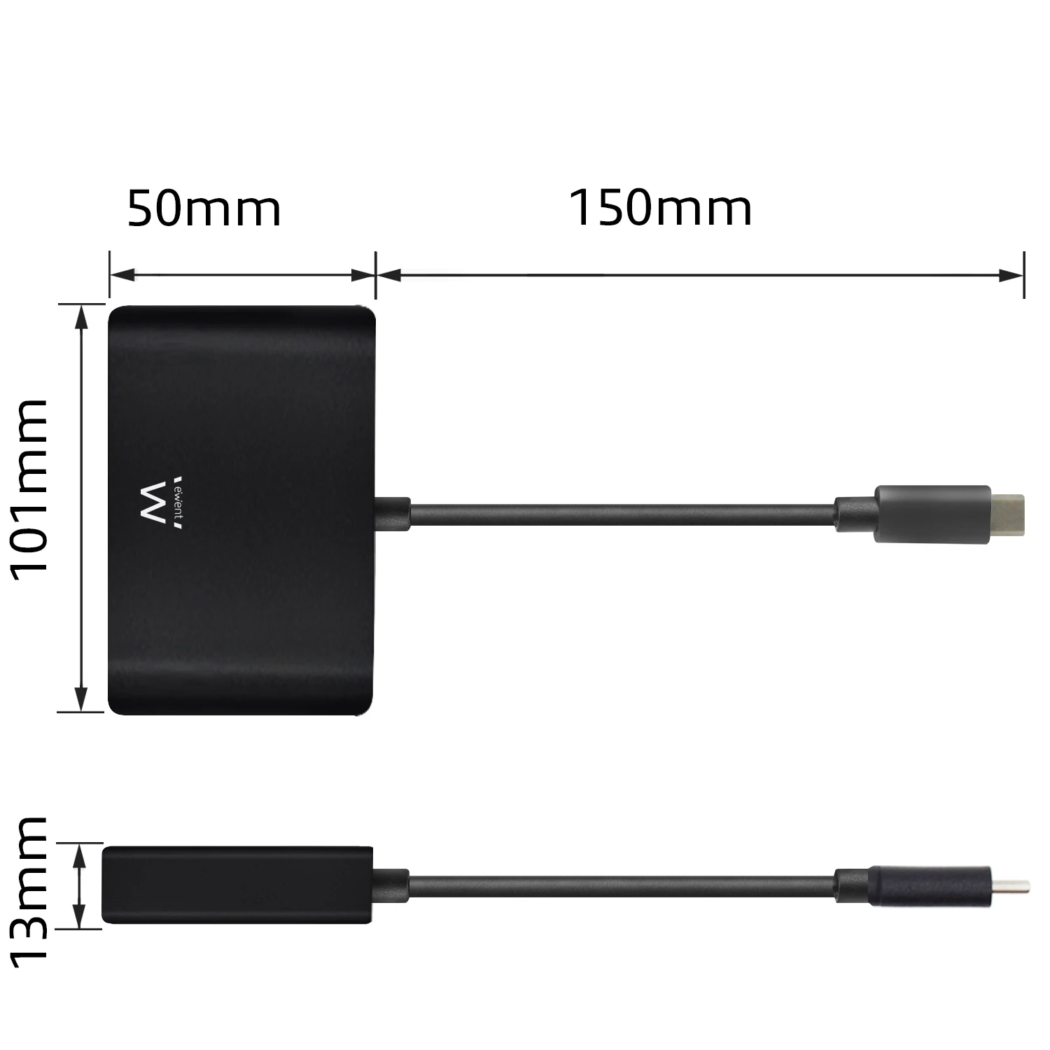 Ewent EW9827. Interfaz de host: USB 3.2 Gen 1 (3.1 Gen 1) Type-C. Ethernet LAN, velocidad de transferencia de datos: 10,100,1000 Mbit/s. Color del producto: Negro, Interfaces de concentradores: HDMI, RJ-45, USB 3.2 Gen 1 (3.1 Gen 1) Type-A, VGA. Tipo de fuente de alimentación: USB. Ancho: 101 mm, Profundidad: 50 mm, Altura: 13 mm