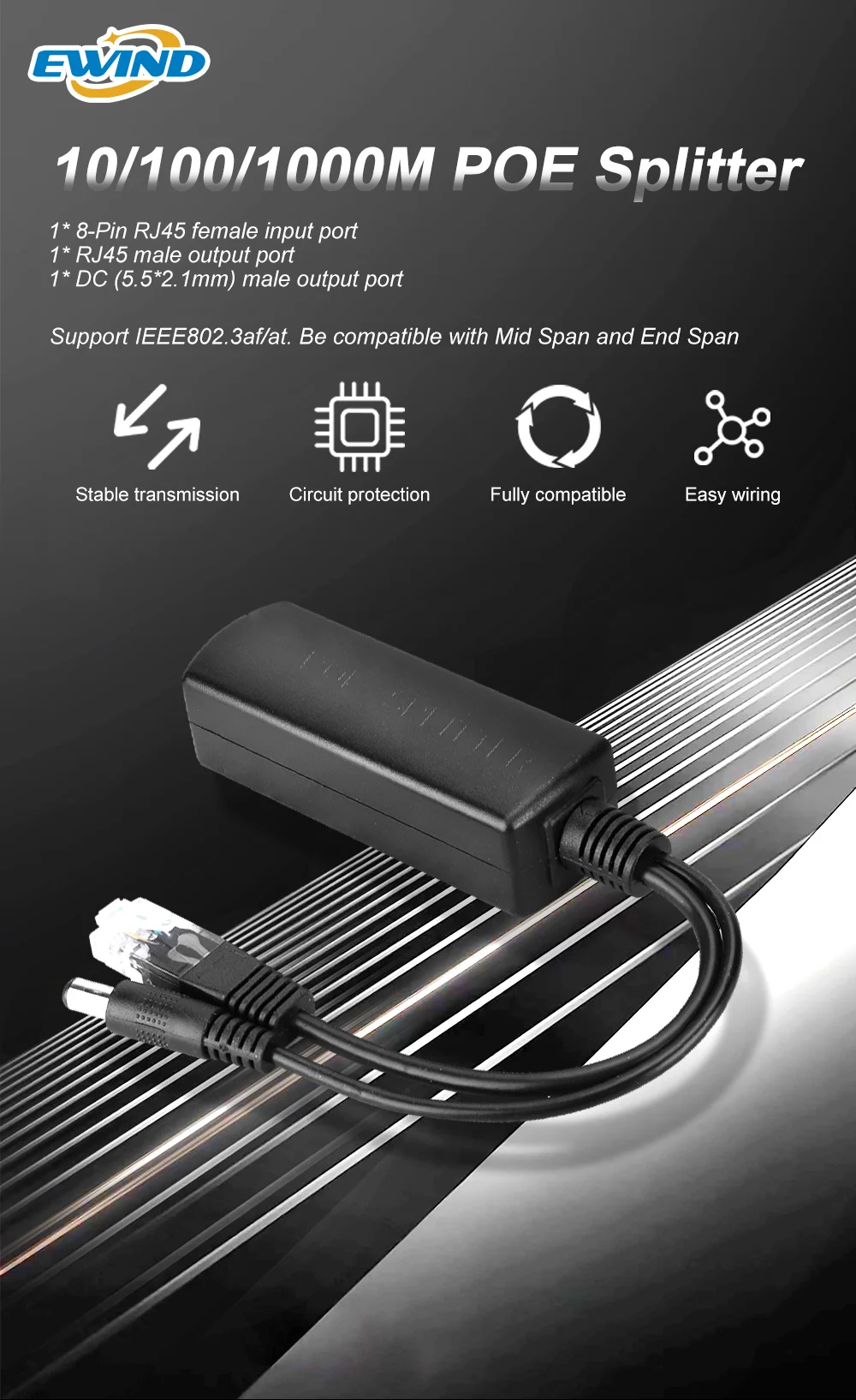 EWIND Gigabit POE Splitter 10/100/1000Mbps IEEE802.3af/AT 44-57V a 12V Fuente de alimentación para cámara IP AP inalámbrico o dispositivo no POE