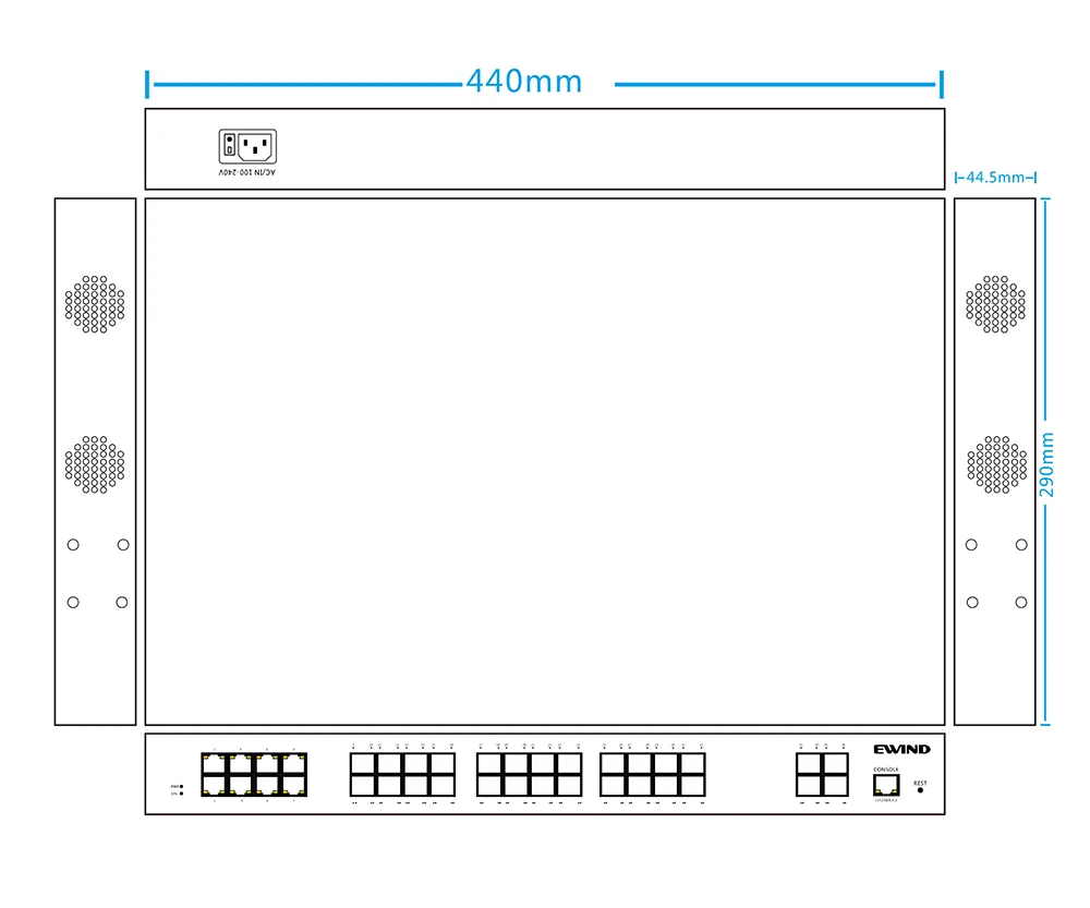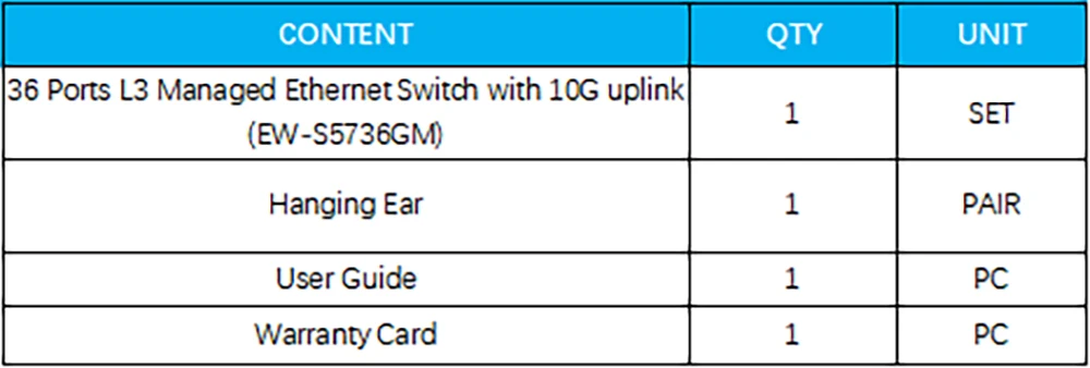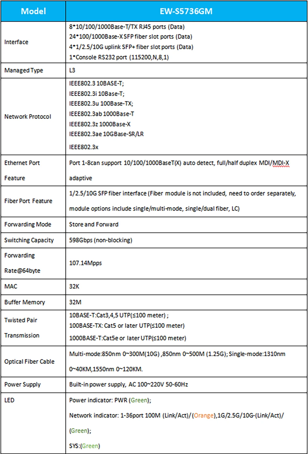 La serie EW-S5736GM es un interruptor ethernet gestionado de tres capas de subida de 10G. Tiene 8*10/100/1000Base-T puertos RJ45 y 24*100/1000Base-X puertos de ranura SFP de fibra y 4*1/2.5/10G SFP + puertos de ranura de fibra.