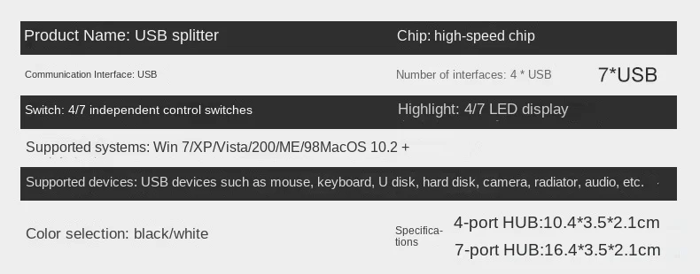Nombre del producto: Interruptor de 4/7 puertos USB2.0hub de alta velocidad