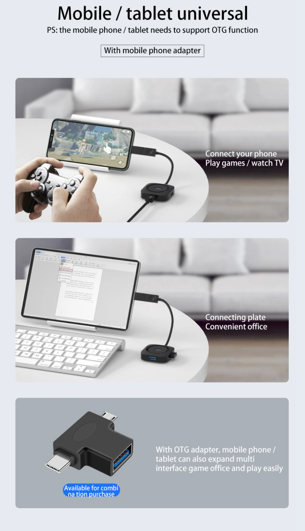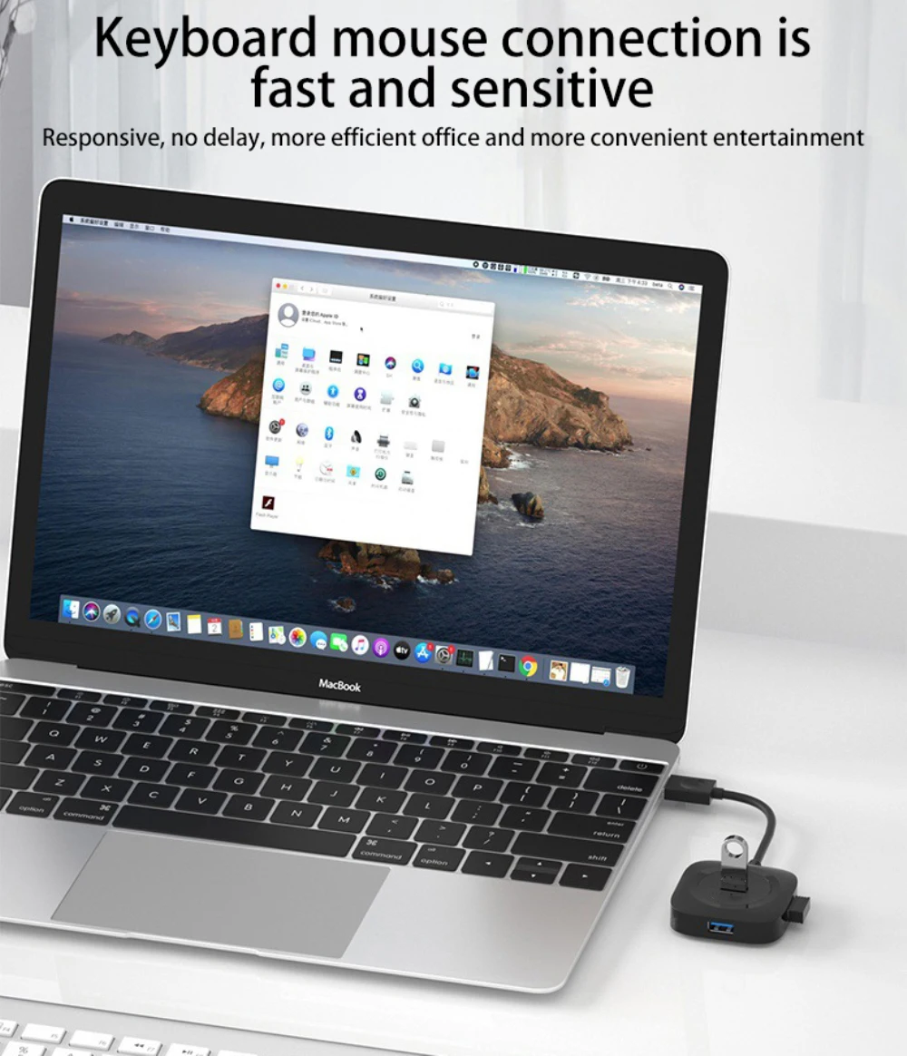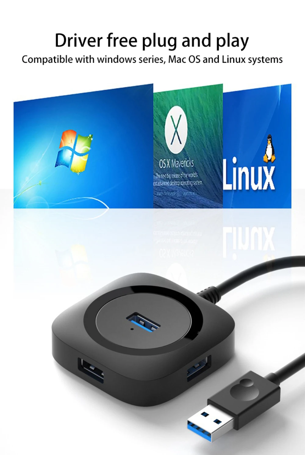 1. Amplio rendimiento. Transforma uno de los puertos USB de tu ordenador en cuatro con este concentrador USB con amplia compatibilidad, incluido el cable USB, el teclado del ratón de la unidad flash, etc. (no admite carga)