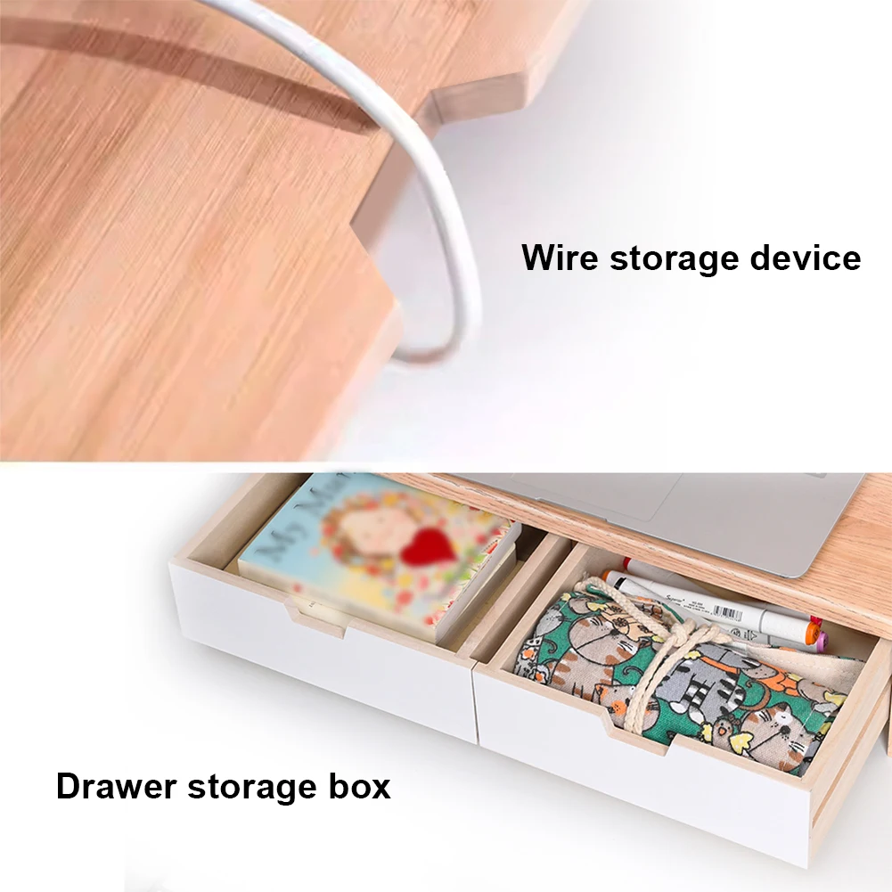 4.Gran capacidad de peso y ahorro de espacio:Con dos cajones espaciosos, este exquisito soporte para monitor ofrece un amplio espacio de almacenamiento, manteniendo su escritorio organizado y ordenado.Puede contener varios suministros de oficina, incluidos libros, cuadernos, auriculares y documentos.