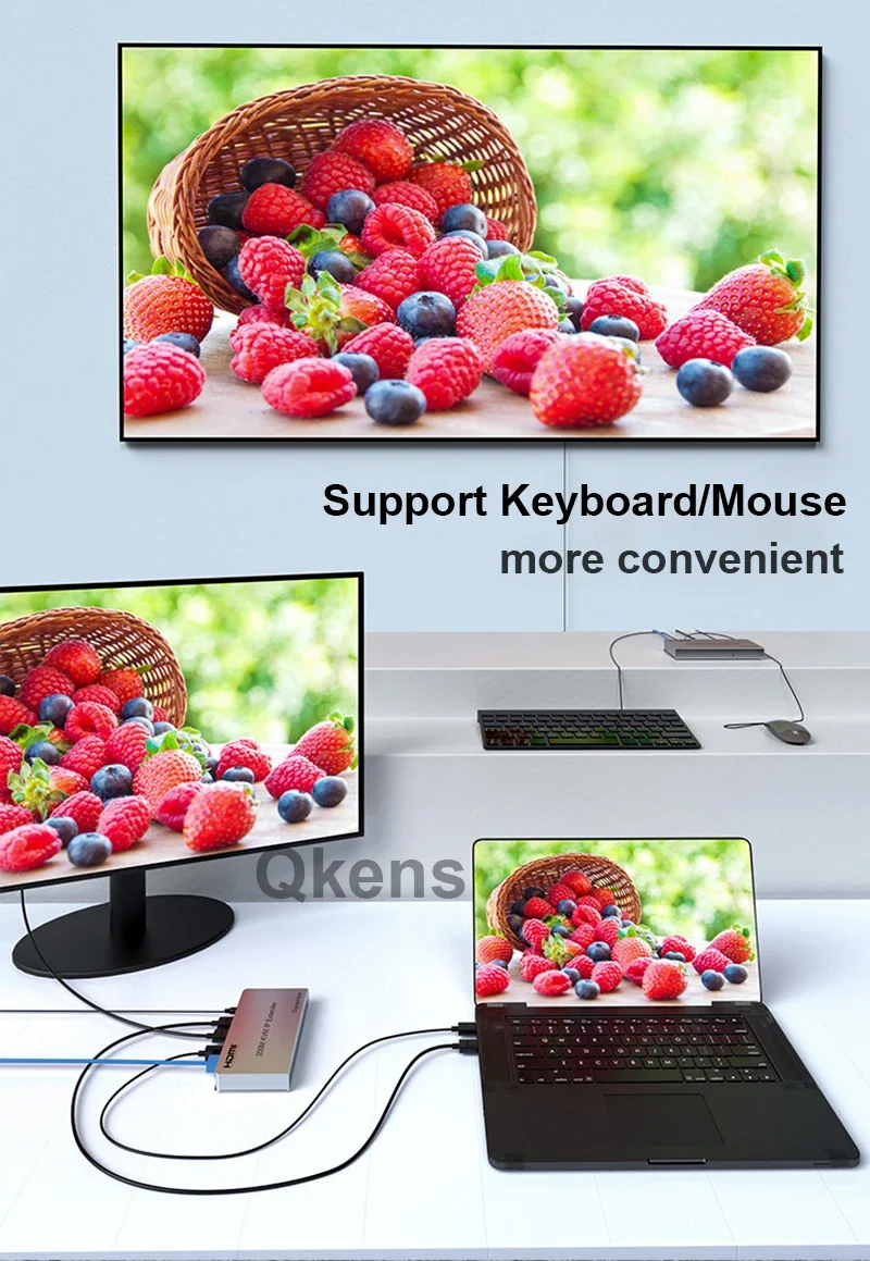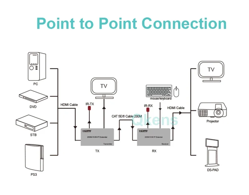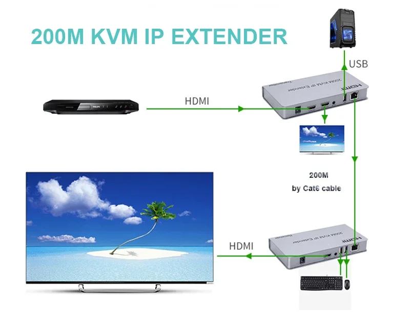 hasta 200 metros de distancia de su DVD o fuente de computadora usando un cable CAT5e/6.Al mismo tiempo, es conveniente transmitir fuente de audio y video HDMI en modo punto a punto, plug and play y admite USB