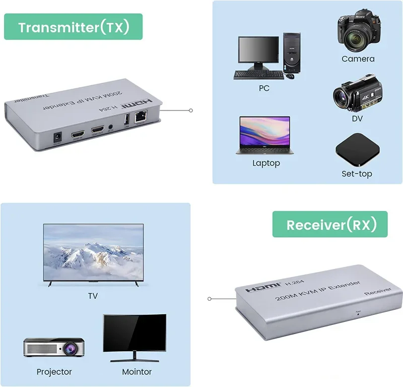 Este extensor IP HDMI de 200 M se basa en el estándar TCP/IP.Transmite tu pantalla HD con alta resolución