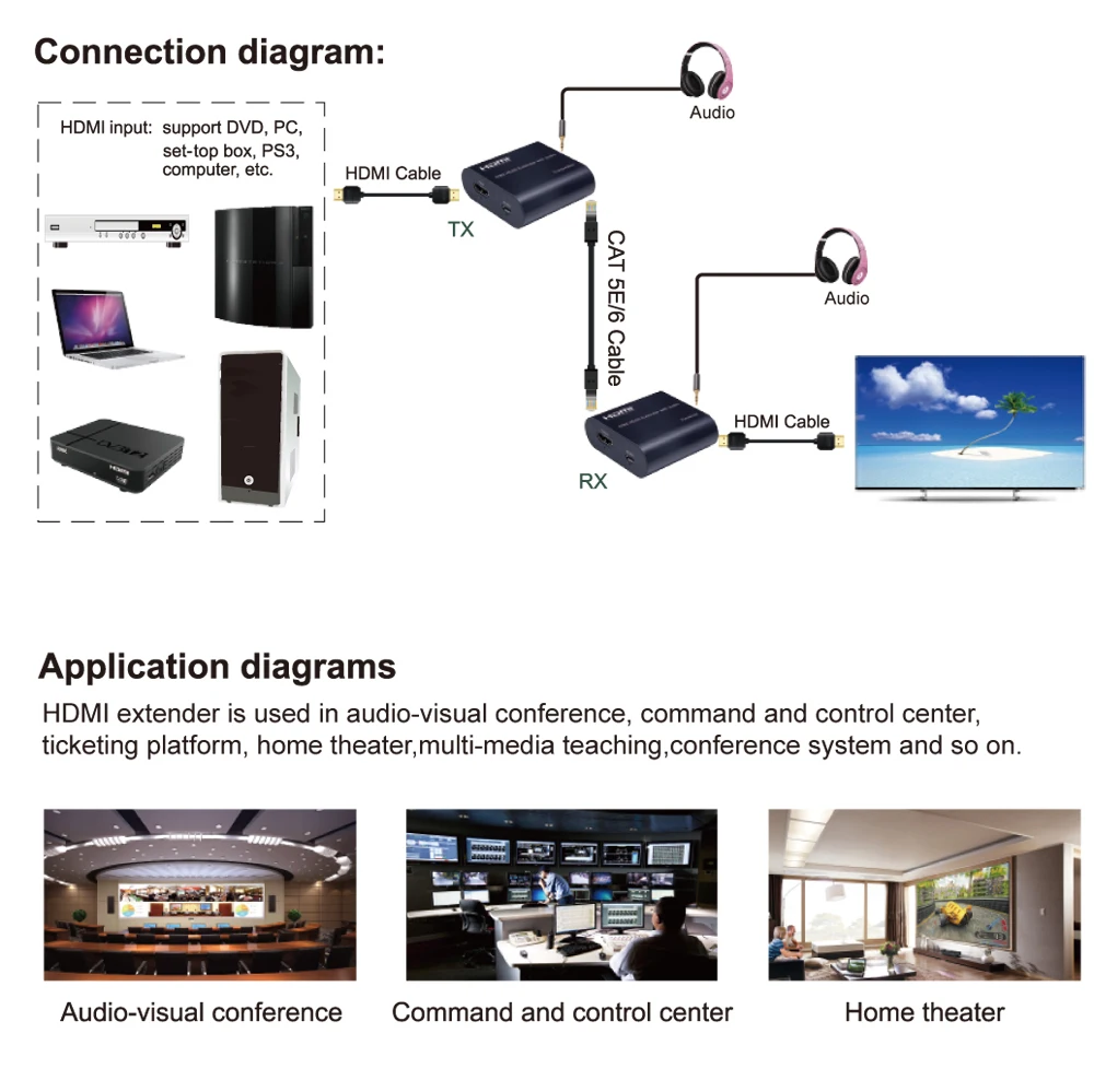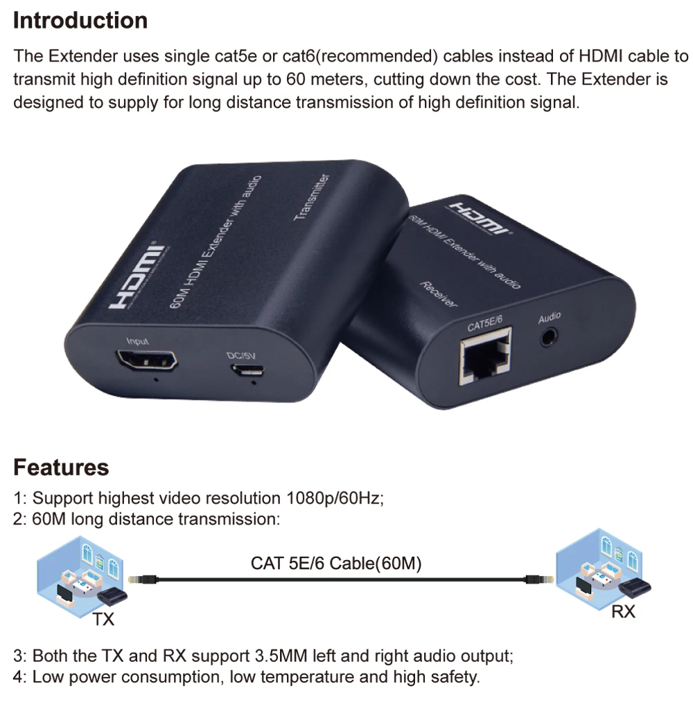 Comprar Extensor de Audio y vídeo de 120M, 4K, Cable CAT5e/6 vs 60M, 1080P, Ethernet, transmisor para PS4, PC, portátil y TV