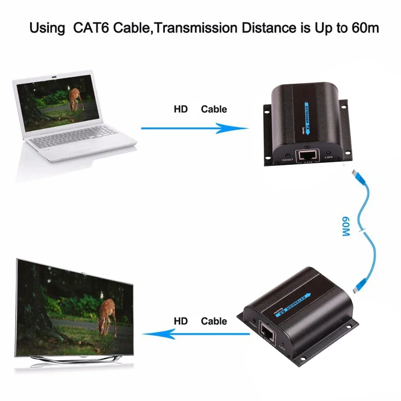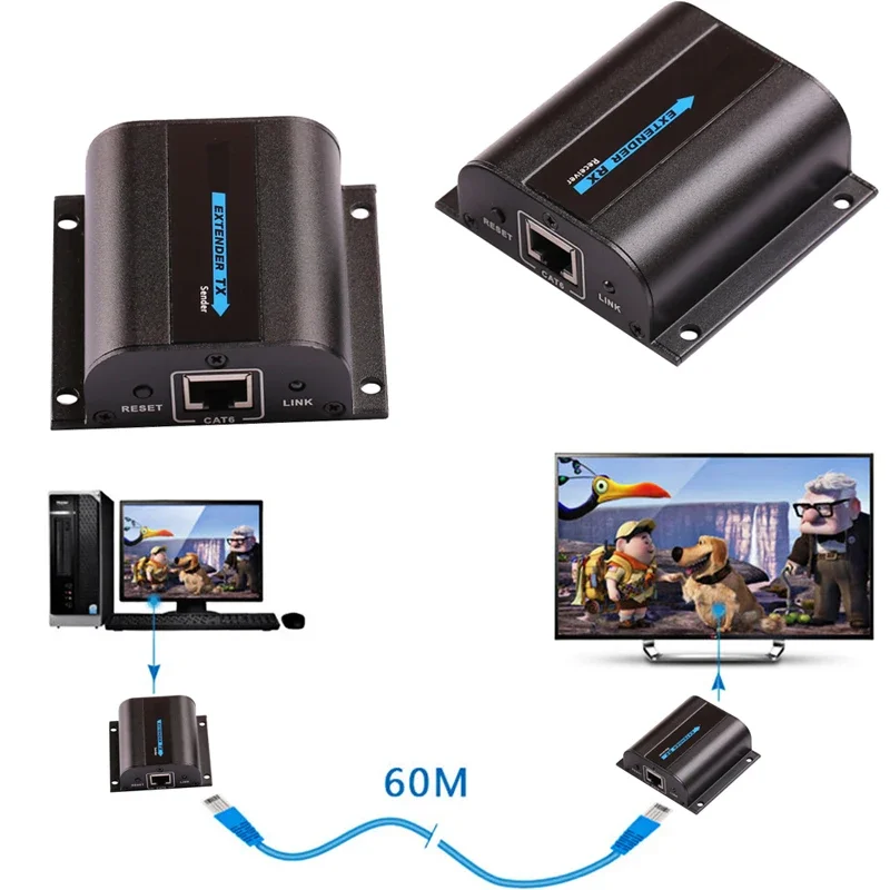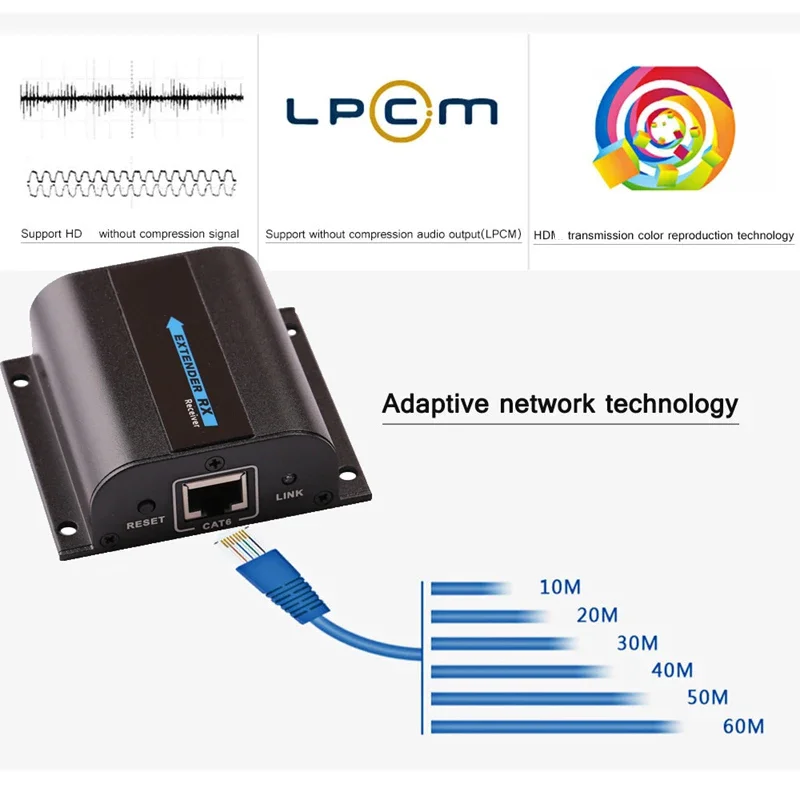 Transmisión de cable único HD: extiende la señal HD 1080P a 60 M a través de cables cat6 o de nivel superior.