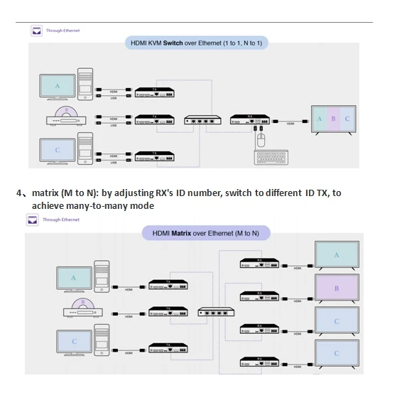 El extensor HDMI H.264 adopta el protocolo Ethernet TCP/IP estándar, transmite video y audio HD a través de un solo cable Cat6 y admite aplicaciones de uno a muchos con interruptores POE. El equipo tiene una excelente capacidad de procesamiento y transmisión de imágenes, hace que la transmisión de señal sea más suave y estable, es una forma económica y eficiente de extensión de señal HDMI.