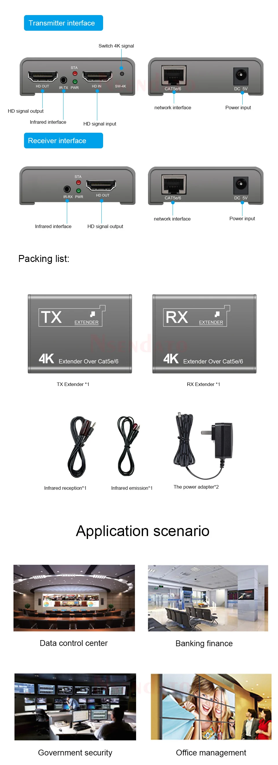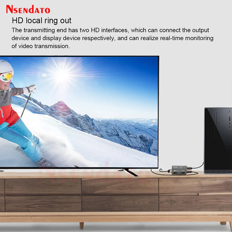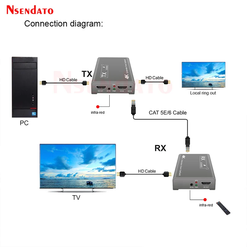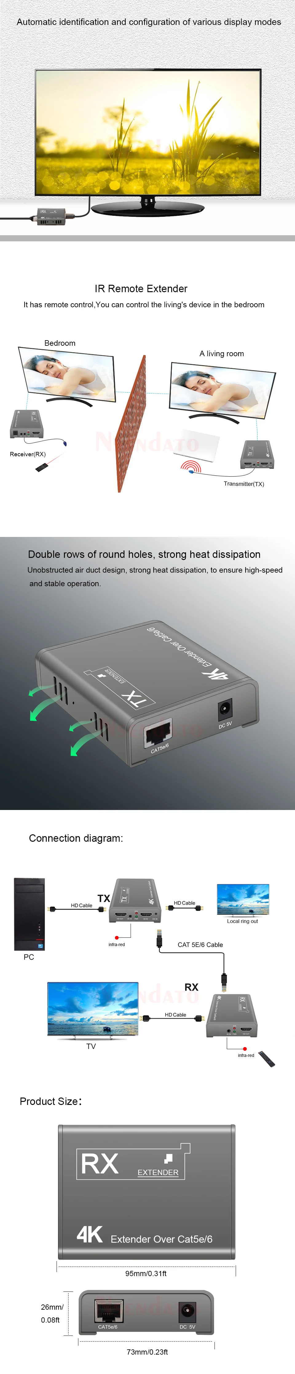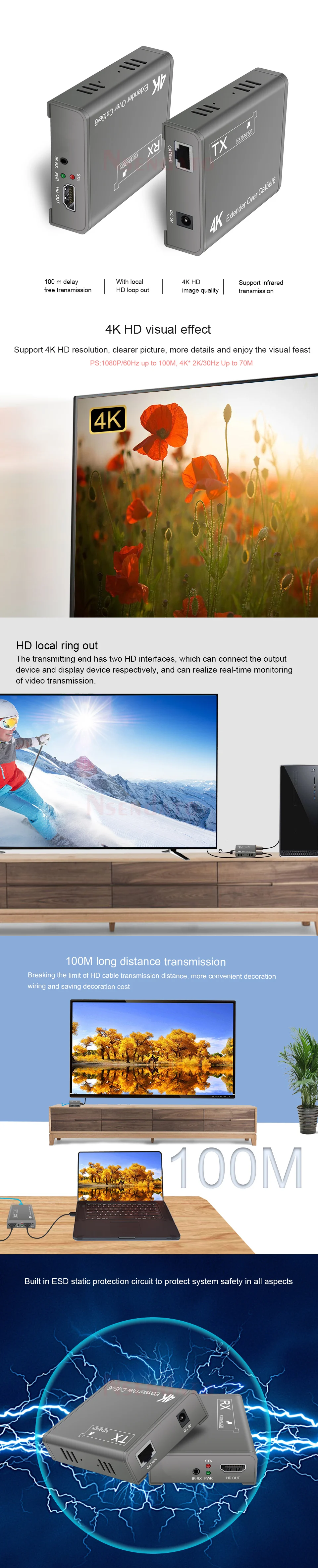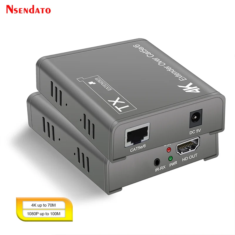 IntroducciónEl Nsendato del extensor Compatible con 4K HDMI puede transmitir señal de alta definición de reproductor de DVD de rayos azules, PC y otros equipos a través del cable Cat5e/6 (recomendado),. Soporta la resolución más alta de 4K × 2K 70M, 1080P/4K distancia de transmisión de hasta 100 metros, admite transmisión infrarroja, admite Salida de bucle. El producto es estable, fácil de instalar y muy práctico, se puede utilizar en grandes proyectos, salas de reuniones y otros lugares.Características1. Soporta la distancia máxima de transmisión: 1080P/4K hasta 100M2. Admite la resolución más alta de hasta 4K × 2K @ 30Hz 70M.3. Compatible con HDMI versión 1,44. Admite transmisión IR5. Admite Salida de bucle6. Alta compatibilidad, puede emparejar automáticamente la fuente y el dispositivo de visualización7. Sistema de ajuste automático integrado, hace que la imagen sea suave, clara y estable.8. Sistema de Protección ESD integrado9. Fácil de instalar, plug and playEspecificaciónNormas: Compatible con HDMI 1,4/HDCP 1,4Reloj máximo de píxeles: 340MHz,digitalVelocidad máxima de datos: 10,2 GbpsResolución máxima: 3840 × 2160 @ 30Hz(4K @ 30Hz).Conector: conector Compatible con HDMIImpedancia: ΩInterfaz: asiento de 3,5mmDirección de la señal: unidireccionalIR Frecuencia: 30-60KHzInterfaz UTP: RJ45Distancia de transmisión: 1080P 100M/4K 70MPaqueteTransmisor transmisorReceptorAdaptador de corrienteManual de usuarioNota: El terminal IR TX/RX es una opción, contáctenos si lo necesita y lo ha pagado