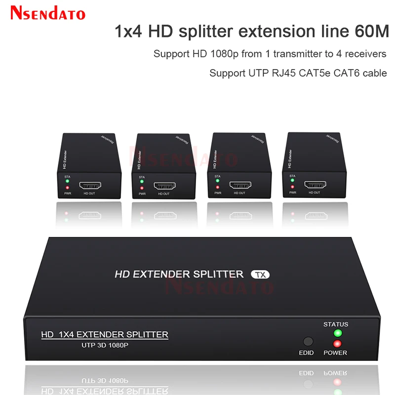 Comprar Extensor divisor HD de 200 pies, Cable de extensión de 1x4 60m sobre UTP RJ45 Cat5e 6 para transmisor HD 1080P 1 a 4 receptores, extensor HD