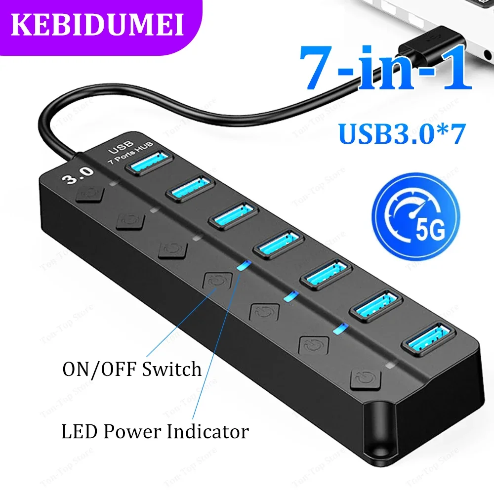 Comprar Extensor de estación de acoplamiento USB 3,0 Hub de 7 puertos, divisor USB de transmisión de alta velocidad de 5Gbps con interruptor de encendido/apagado para ordenador portátil Macbook