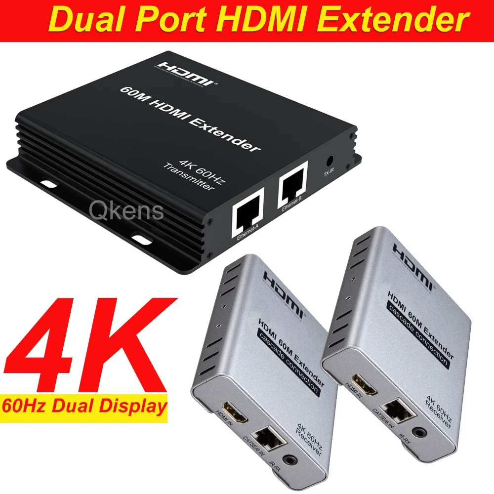 Comprar Extensor Ethernet 4K 60hz 60m a través de Cable Rj45 Cat6, transmisor y receptor de Audio y vídeo, convertidor, extensor Hdmi de 1 a 2 pantallas duales