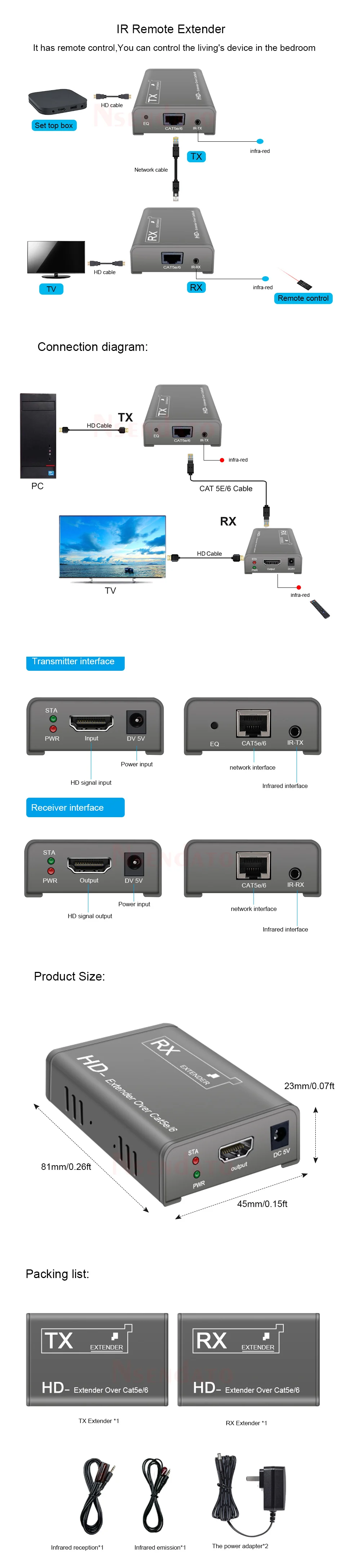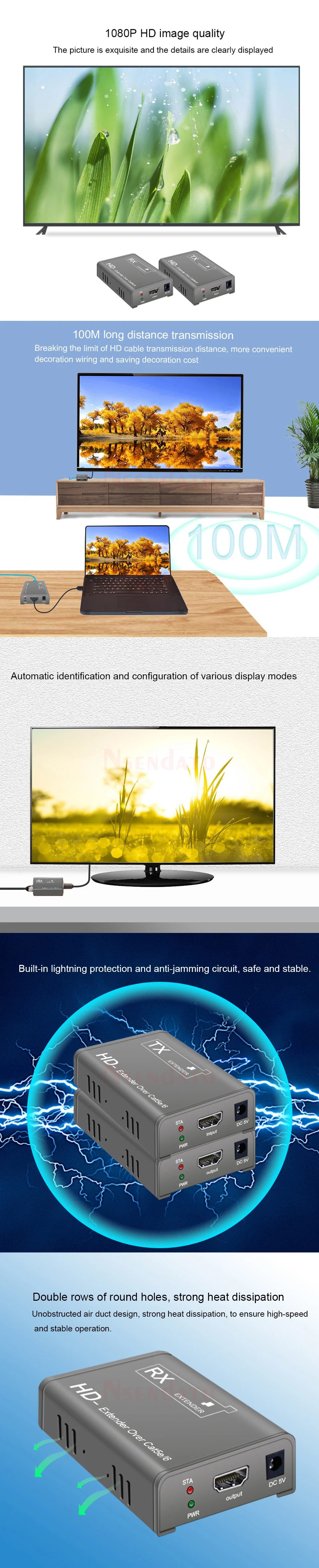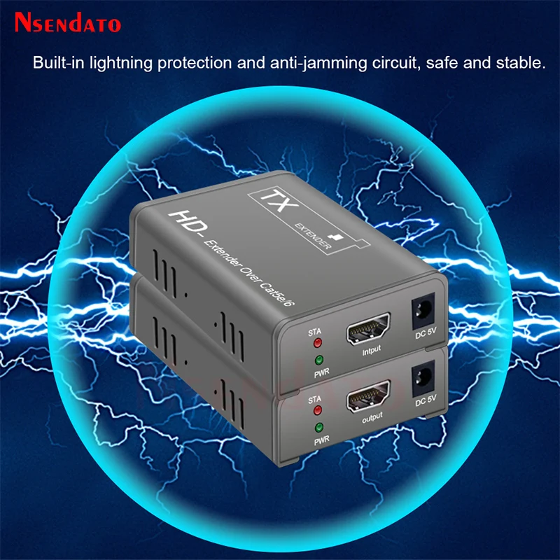 El Nsendato del extensor HDMI puede transmitir señal de alta definición de reproductor de DVD, PC y otros equipos a través del cable Cat5e/6 (recomendado), admite una distancia de transmisión de 1080P de hasta 100 metros, admite transmisión infrarroja. El producto es estable, fácil de instalar y muy práctico, se puede utilizar en grandes proyectos, salas de reuniones y otros lugares.