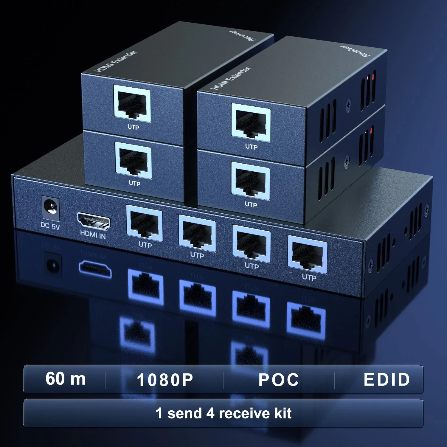 Comprar Extensor Ethernet HDMI 1x2 1x4 de 60m, divisor HDMI de 1 a 4, 1 transmisor y distribuidor de vídeo receptor 2 o 4 a través del Cable RJ45 Cat6