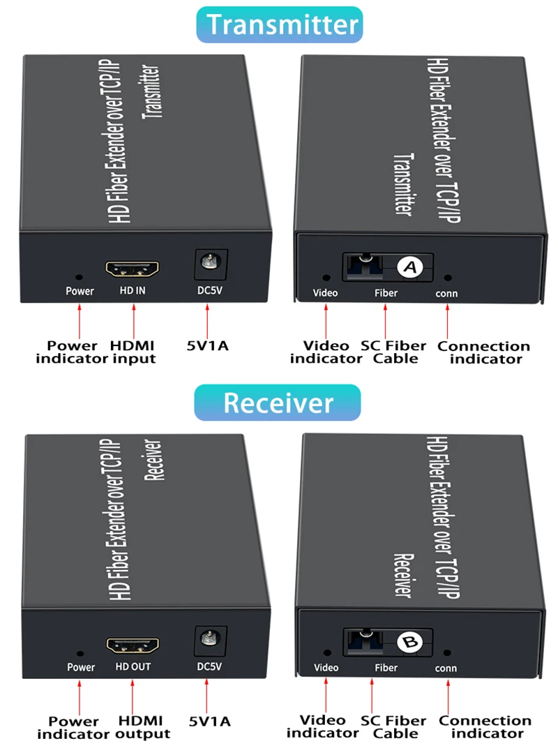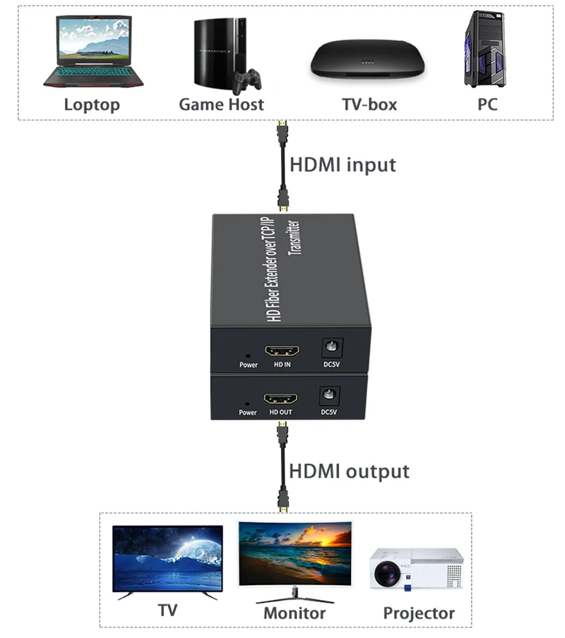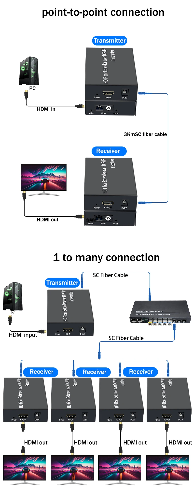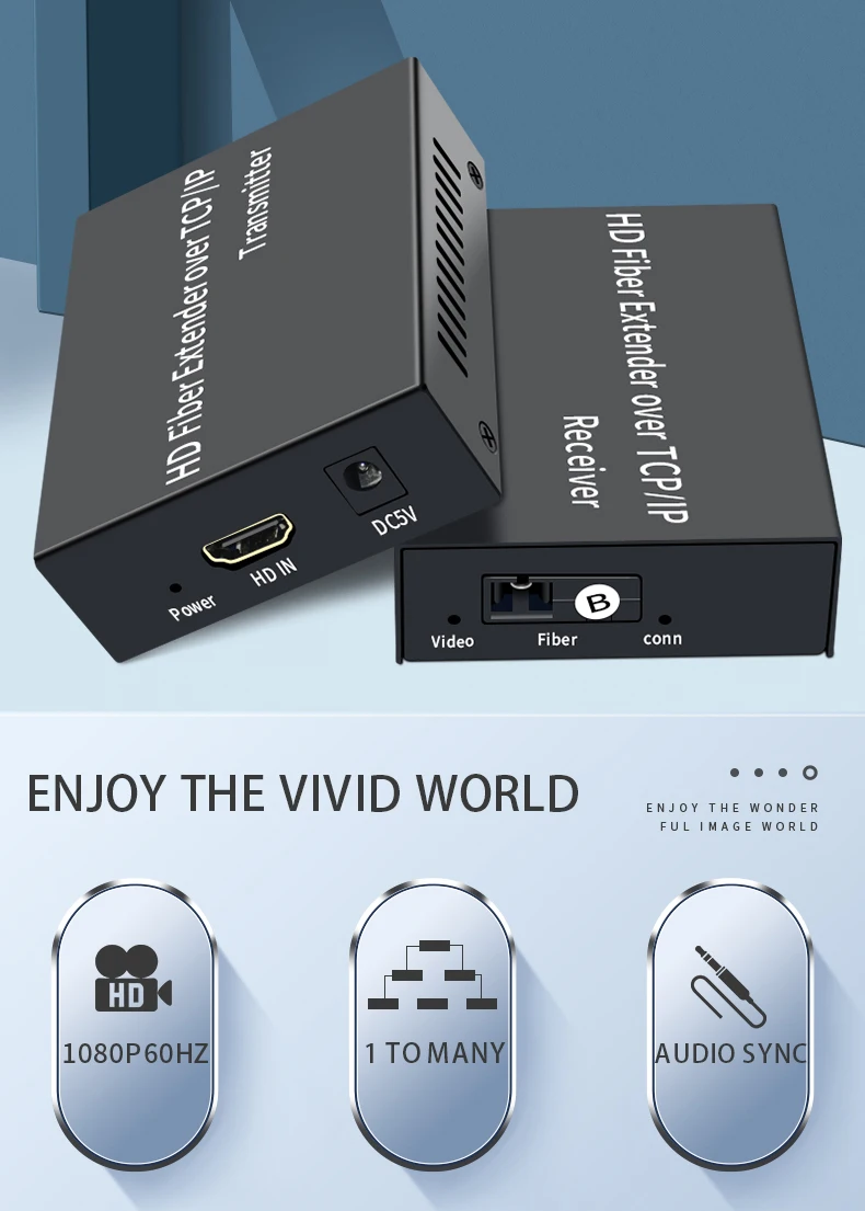 El extensor sobre fibra utiliza una pieza de cable de fibra para extender la pantalla HDTV hasta 3KM o 20KM Para 1920*1080P @ 60Hz, no solo rompe la limitación de la longitud de transmisión del cable HDMI, sino que También la fibra tiene más flexibilidad y comodidad en la construcción del cable.
