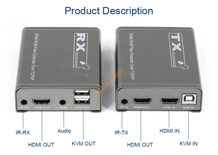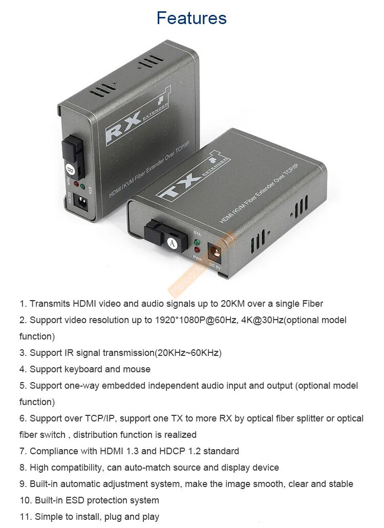 The extender provides extension of HD signals long distances over a single Fiber, it supports high resolution up to 1080P, KVM and IR signal transmission. The extender can use for a wide range of applications requiring long distance transmission of high resolution with high quality by its good stability and powerful security.