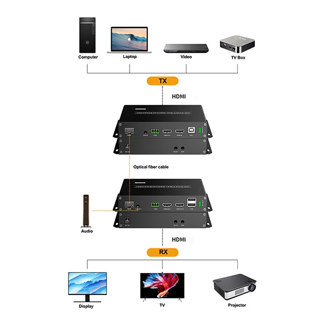 El extensor de fibra óptica HDMI proporciona extensión de señales HDMI a largas distancias sobre un cable de fibra óptica. Soporta alta resolución de hasta 3840*2160 a 60Hz. El extensor se puede utilizar para una amplia gama de aplicaciones que requieren transmisión a larga distancia de alta resolución con alta calidad por su buena estabilidad y potente seguridad.