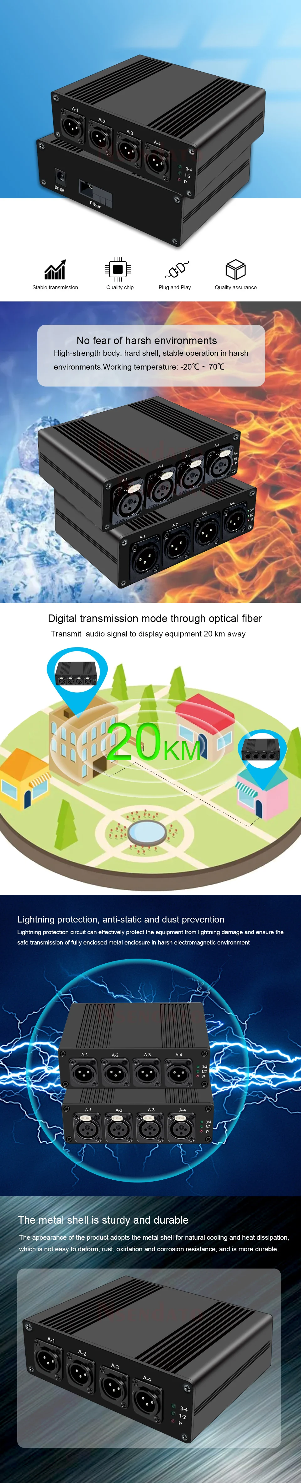 4 Channels XLR Balanced Audio Fiber Optical Extender Over Optical Fiber 20km XLR Balanced Audio Transmitter and Receiver Kit