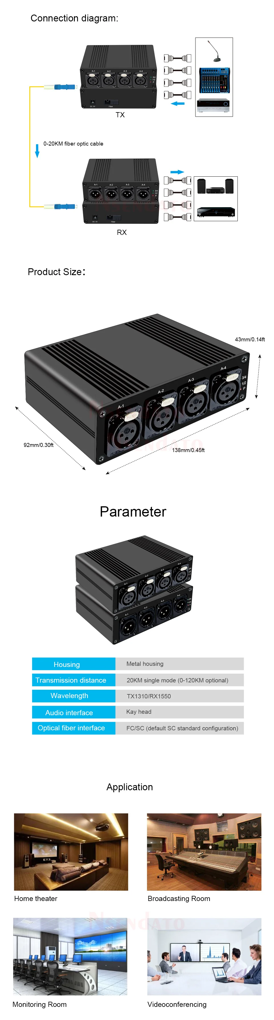 Introduce:Nsendato of digital four channel audio optical transceiver can use one optical fiber to transmit four channel forward audio signals.The audio signal adopts 24bit/96KHZ digital sampling to ensure high fidelity transmission; digital optical transmission channel ensures high-quality signal transmission. It can be applied to game console high fidelity audio equipment, set-top box, HI-FI home theater, large screen projection video conference, public video broadcasting system, remote multimedia education, classroom medical care, military field, flat video media advertisement transmission demonstration, etc.Features:1.Four channels one-way XLR audio optical fiber transmission, with a default distance of 20KM (0-120KM optional)2.High speed synchronous digital transmission technology3.The optical dynamic technology is adopted, and no adjustment is required during use4.No electromagnetic interference, no radio frequency interference, no ground current5.Ensure safe transmission in harsh electromagnetic environmentDescriptionAudio characterAudio input impedance:10KAudio output impedance:600ΩInterface mode:Balanced XLRInput/output amplitude ratio:1/1frequency response:20HZ-20KHZAudio sampling rate:24bit/96KHZSignal-to-noise ratio:≥75dBAudio interface:XLRoptical characterTransmission wave length:TX:1310nm、RX:1550nmOptical interface:FC/SC(Default SC standard)Transmitting optical power:Max 10dB/20KMReceiving sensitivity:-35@155MB/SOptical dynamic range:-39dB~-42dBOptical allowable maximum chain loss:25dBTransmission distance:20KM(Single mode)Installation Process:1,Connect the audio signal source to the transmission end of XLR audio fiber extender;2,Connect the receiving end of XLR audio fiber extender to the audio and power amplifier;3,Connect the optical fiber interface between the sender and the receiver with one optical fiber cable;4,Connect the sender and the receiver to the power supply. When the indicator lights up normally, the system operates normallyPackageXLR transmitterXLR receiverPower adapterUser manualNoted:the link have two model ,one model with SC Port ,one model with FC Port ,so please kindly select what your needed