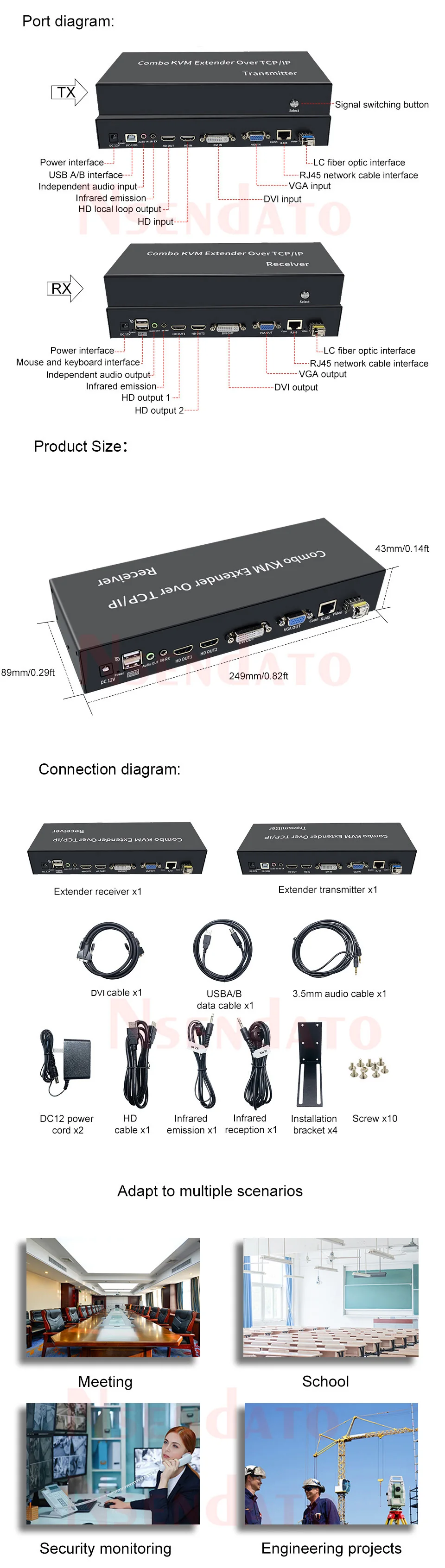 Nota:1.TX RX incluyendo el transmisor + receptor; ¡RX es solo el receptor, pero la descripción es para el conjunto completo! ¡Por favor, selecciónelo de acuerdo con su solicitud!Los 2,20 km se conectan a través del cable de fibra óptica, los 120M se conectan a través del cable Ethernet 2/6.Introducción:El extensor sobre Fibra de 1/2/6 utiliza una pieza de cable de fibra de 1/2/6 para extender la pantalla compatible con HDMI/DVI/VGA hasta 120 metros o 20km para 1920*1080P @ 60Hz, no solo rompe la limitación de la longitud de transmisión del cable compatible con HDMI/DVI/VGA, sino que también el cable de longitud de transmisión de la fibra/6 o de la fibra, que tiene más flexibilidad y comodidad en la construcción del cable. Está equipado con HDMI compatible/Conectores DVI/VGA que proporcionan una mayor flexibilidad y opciones al integrar varios componentes de cine en casa. Ofrece soluciones para consumidores residenciales: venta al por menor de HDTV y sitio de espectáculos, HDTV,STB, fábricas de DVD y proyectores, preocupaciones de espacio y seguridad, control de centros de datos, distribución de información, presentación en salas de conferencias, entornos de formación escolar y corporativa.Características:Un par como módulo funcional completo, sin necesidad de configuración.El cable de fibra de 1/2/6 puede sustituir al cable HDMI para lograr una transmisión de larga distancia.Se sigue el estándar de la IEEE-568B de la marca, el número de unidades, el número de unidadesLa resolución de vídeo puede ser de hasta 1920*1080P @ 60Hz.Velocidades de señalización de hasta 1.65bps para una pantalla de 1920*1080P @ 60Hz.Compatible-HDCPAdmite audio sin comprimir como LPCMSoporta audio comprimido como DTS Digital, Dolby Digital (incluidos los sistemas de audio de alta definición y Dolby True HD).El remitente con salida de bucle compatible con HDMI, entrada y salida de audio Ir.El receptor con salida de audio separada y entrada Ir.El receptor con dos salidas compatibles con HDMI, una salida DVI y una salida VGA.Las teclas de acceso rápido del teclado pueden iniciar/reiniciar el ordenador conectado al remitente con un cable especial Compatible con HDMI/DVI/VGA.El audio analógico separado se puede transmitir del emisor al receptor a través del cable de audio VGA + especial.EspecificaciónSeñal de vídeo de entrada: 0,5-1,0 voltios p-pSeñal DDC de entrada: p-p 5 voltios (TTL)Rango máximo de enlace único: 1920*1080, 1080pSalida de vídeo: compatible con HDMI/DVI/VGAInterfaz de ratón/teclado: USBDTV/HDTV:1080p/1080i/720p/576p/480p/576i/480iDistancia de transmisión: 120 metros o 20kmEntrelazado (50 y 60Hz):480i 576i 1080iProgresivo (50 y 60Hz):480p,576p,720p,1080pConsumo de energía: 5 vatios (máx.)Paquete:TransmisorReceptorAdaptador de corriente DC12VCable de USB,Cable IRManualComprar Extensor de fibra óptica para teclado y ratón, transceptor de vídeo USB, 20Km, HDMI, KVM, sobre SC, DVI, VGA, RJ45, 120M
