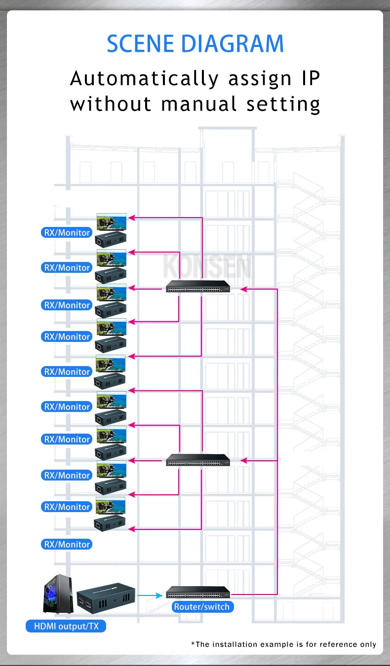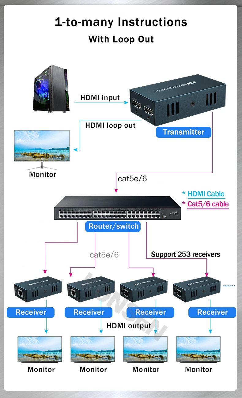 El extensor HDMI proporciona extensión de señales HDMI a largas distancias a través de un solo cable CAT5/5E/6, admite transmisión de señal de alta resolución de hasta 1080P. El extensor se puede utilizar para una amplia gama de aplicaciones que requieren transmisión a larga distancia de alta resolución con alta calidad por su buena estabilidad y potente seguridad.