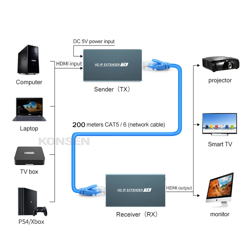 Comprar Extensor HDMI de 200M sobre Cat5e/6 HDMI a rj45 sobre IP/TCP por interruptor Ethernet de uno a varios monitores, vídeo extendido de 1080P