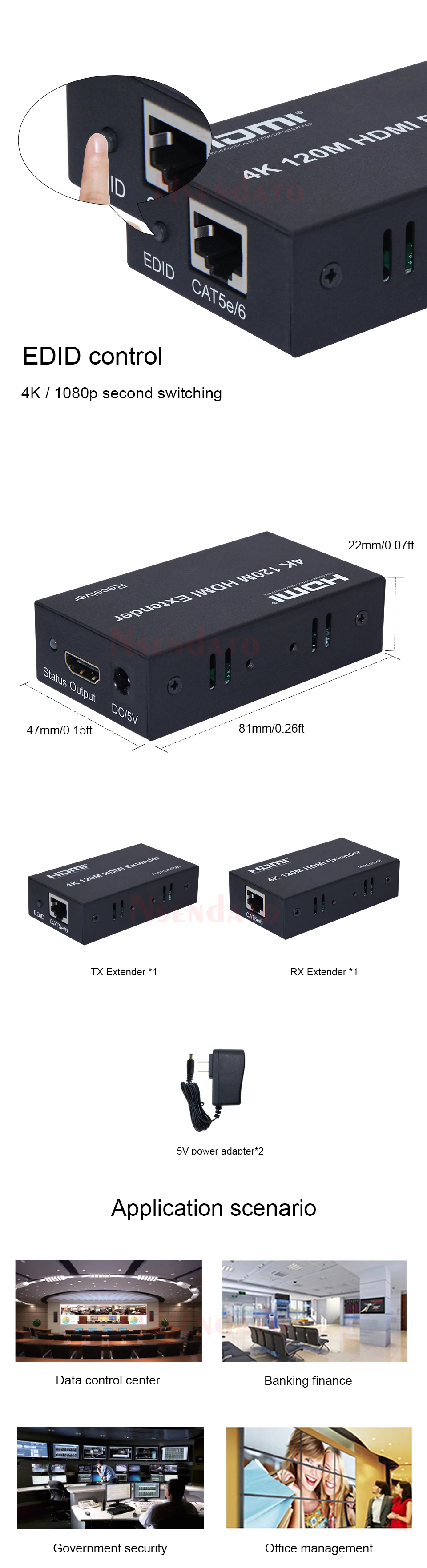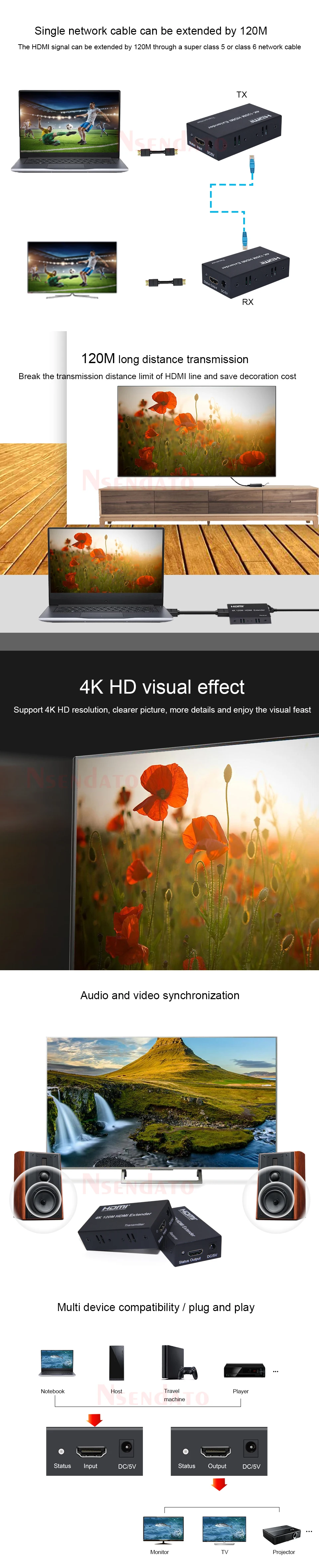 IntroducciónEl extensor utiliza cables individuales cat5e o cat6 (recomendados) en lugar de un cable HDMI para transmitir señales de alta definición de hasta 120 metros. El extensor está diseñado para suministrar transmisiones de larga distancia de señales de alta definición.Características:Admite transmisión de larga distancia de 120 m: cable CAT 5E/6 (120 M)Bajo consumo de energía, baja temperatura y alta seguridad.Especificaciones:Longitud del cable CAT5e/CAT6 entre Rx y TX: 120 metrosEntrada HDMI: 4k/1080p/720p/576p/576i/480p/480iSalida HDMI: 4k/1080p/720p/576p/576i/480p/480iAncho de banda máximo: 340 MHzVelocidad máxima en baudios: 3x3,4 GbpsSeñal de vídeo de entrada: 0,5 ~ 1,5 VSeñal CC de salida: 5VDistancia del cable HDMI de entrada: ≤10 m Cable estándar HDMI AWG26Distancia del cable HDMI de salida: ≤10 m Cable estándar HDMI AWG26Corriente máxima de trabajo TX: 350 mACorriente de trabajo máxima RX: 200 mAFormato del adaptador de corriente: Entrada: CA (50 HZ, 60 HZ) 100 V-240 V; Salida: DC5V/1AConexión y funcionamiento:1. Conecte un cable HDMI entre el dispositivo fuente y el extensor TX, la distancia máxima del cable es de 10 metros2. Conecte un cable HDMI entre el dispositivo de visualización y el extensor RX, la distancia máxima del cable es de 10 metros3. Conecte cables individuales cat-5e o cat-6 (recomendados) en lugar de cables HDMI entre TX y RX Extender, la distancia máxima del cable es de 120 metros.4.Conecte la fuente de alimentación de 5 V al TX y RX.5.Luz indicadora LED Luz indicadora LED TX: cuando no hay entrada de señal, se vuelve azul;Cuando hay entrada de señal, se vuelve rojo y sigue parpadeando.Luz indicadora LED RX: cuando no hay entrada de señal, se vuelve azul;Cuando hay entrada de señal, se vuelve rojo y sigue parpadeando.6.Botón EDID: El botón puede admitir el cambio de EDID entre 1080P y 4K.(4K es el EDID predeterminado cuando se enciende).El paquete incluye:Extensor TX X1PCSExtensor RX X1PCSAdaptador de corriente CC de 5 V/1 A X2 piezas