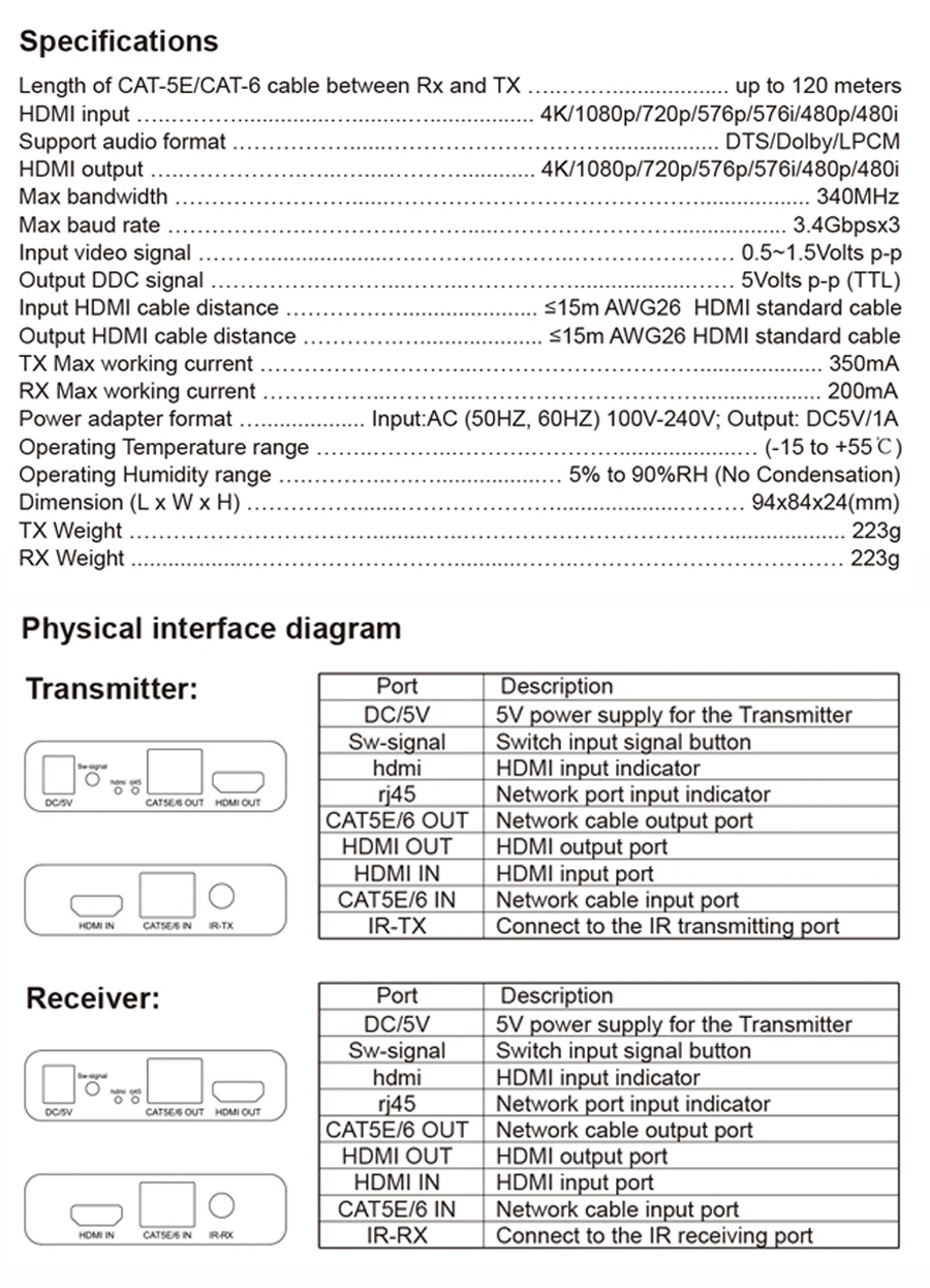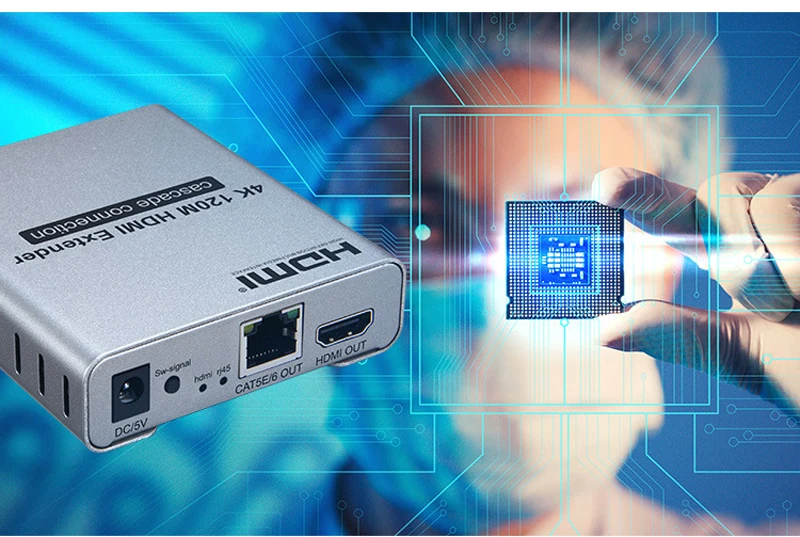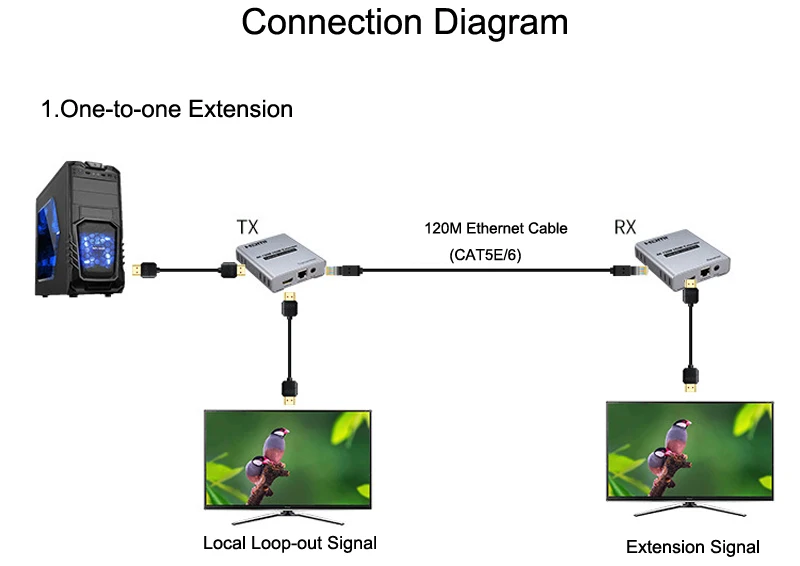 Este extensor de cable integrado reemplaza el cable HDMI con un cable CAT5e o CAT6 (recomendado). Puede transmitir HDMI1.4 4K @ 30Hz HDM1.3 1080P por 120 metros.