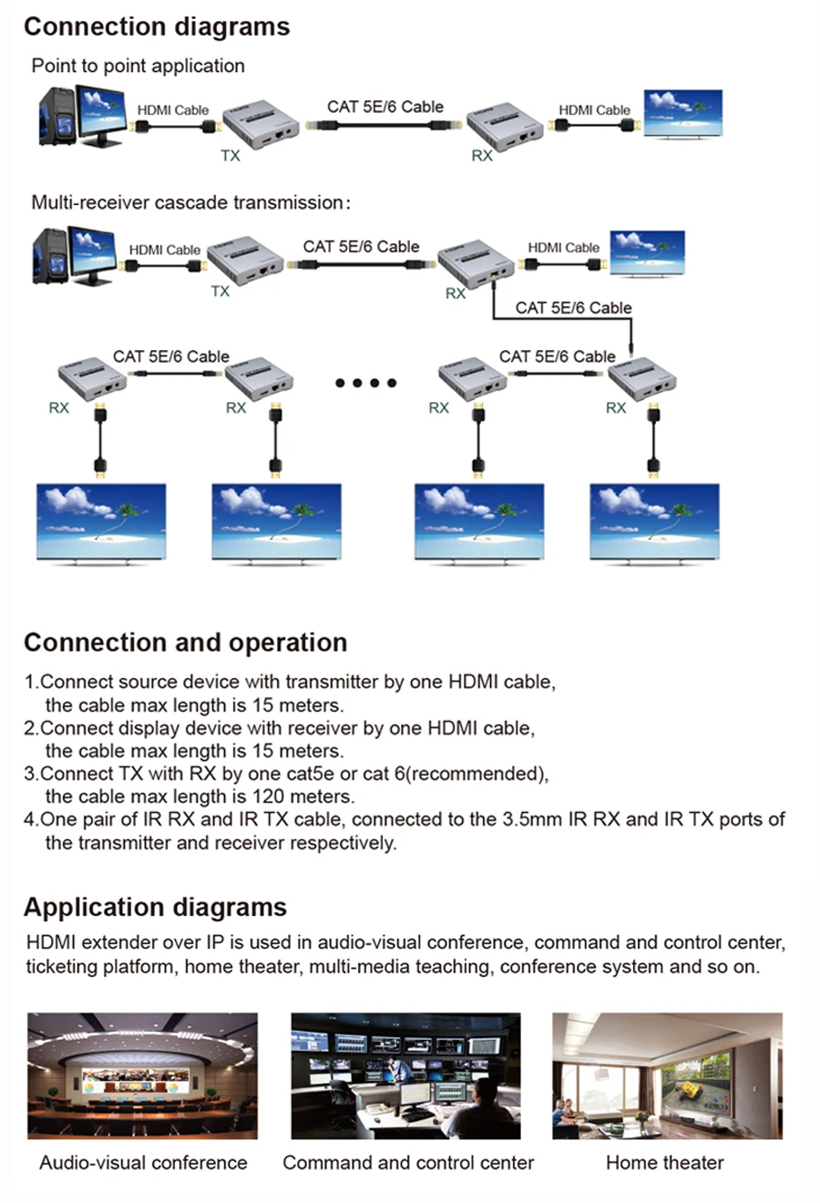 El extensor HDMI se utiliza en conferencias audiovisuales, centros de comando y control, plataformas de venta de entradas, cine en casa, enseñanza multimedia, sistemas de conferencias, etc.