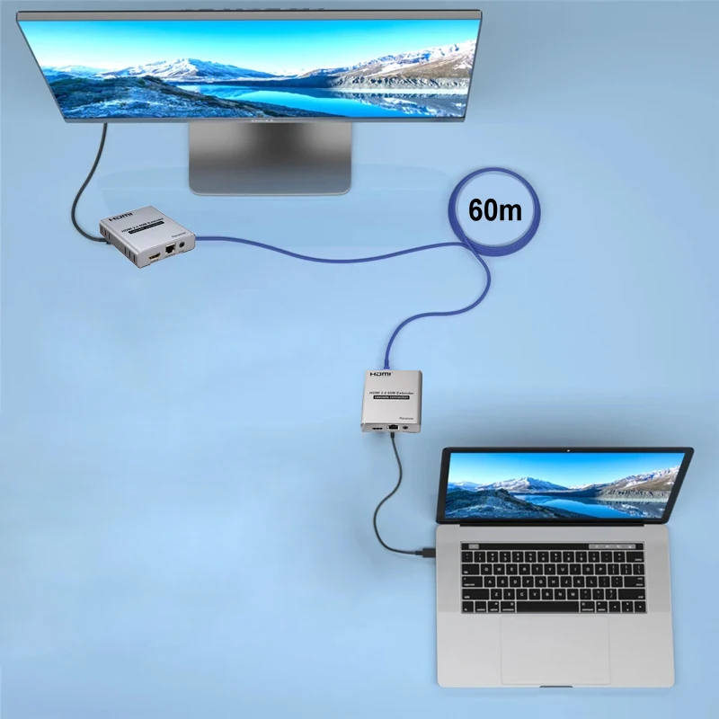 Este extensor HDMI 2.0 de 60 m utiliza un único cable cat-5E o cat-6 (recomendado) en lugar de un cable HDMI.