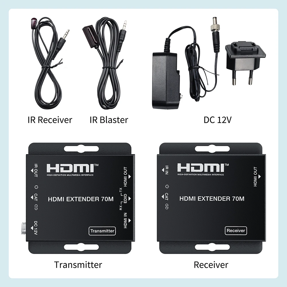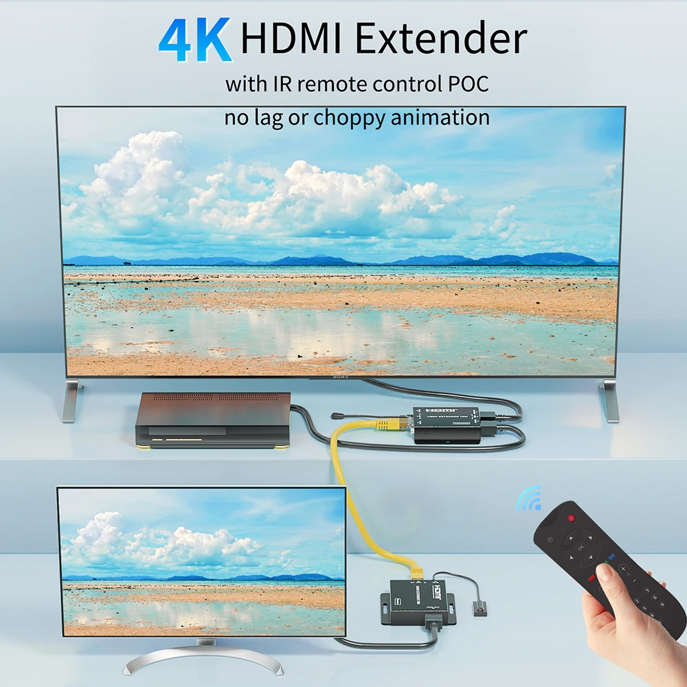 El ED970C es un extensor HDMI 4K.Este extensor HDMI 4K sobre cat6/5e admite resoluciones de vídeo de entrada y salida de hasta 4kX2k@30Hz y extiende una distancia de hasta 40 metros a través de un único cable CAT5e/6 calificado.Y resoluciones de 4K a 30 Hz de hasta 40 M. Conforme a HDMI 1.4 y HDCP 1.4, este extensor HDMI está equipado con un paso IR unidireccional para el control de la fuente.