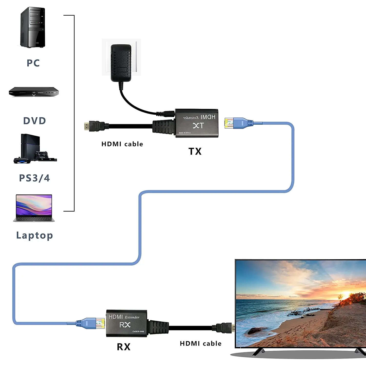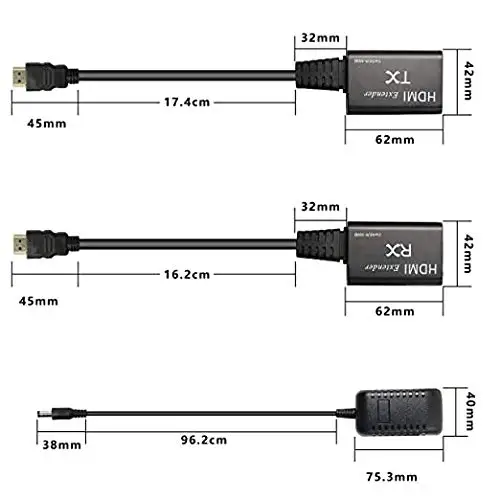 Transmisión de señal: mediante el uso de un solo cable (recomendado) o CAT-6 en lugar de cable HDMI, puede extender la distancia hasta 60 metros entre TX y RX.