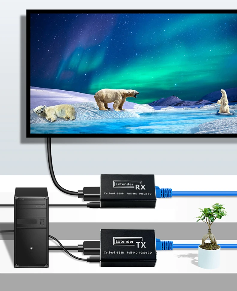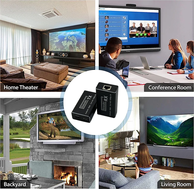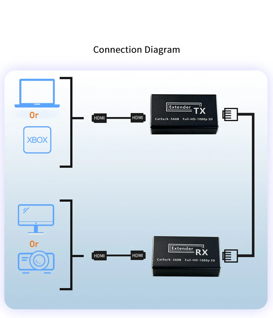 The HDmatters HDMI Extender can transmit HDMI video to distances up to 50M(165ft) over a single qualified Cat6 and above Ethernet cable. It supports 1080p video resolutions and compatible with various kinds of AV devices such as PS4,PS5,PC,laptop.