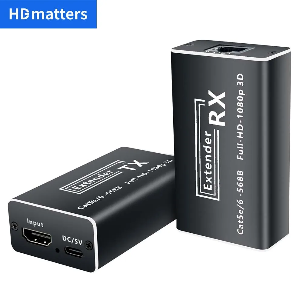The HDmatters HDMI Extender can transmit HDMI video to distances up to 50M(165ft) over a single qualified Cat6 and above Ethernet cable. It supports 1080p video resolutions and compatible with various kinds of AV devices such as PS4,PS5,PC,laptop.