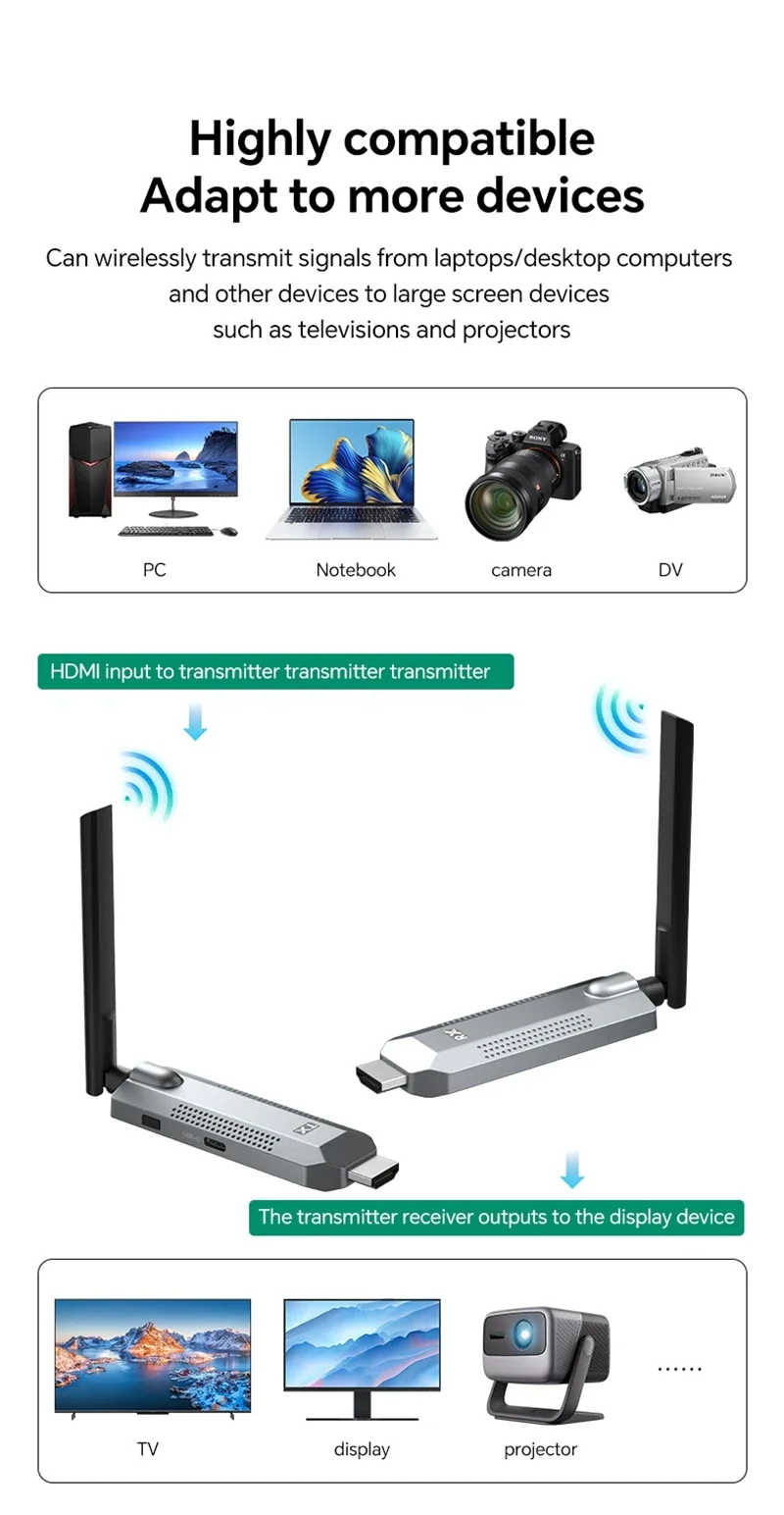Nuevo y de alta calidad, ¡compre con confianza! TX significa transmisor, RX significa receptor Este protocolo de transmisión inalámbrica incorporado del extensor HDMI puede transmitir de forma inalámbrica señales de audio y vídeo HD, Al mismo tiempo, el equipo tiene una excelente capacidad de transmisión y procesamiento de imágenes, emite señales. La transmisión es más suave y estable, es un tipo de forma económica y eficiente de extensión de señal HDMI.