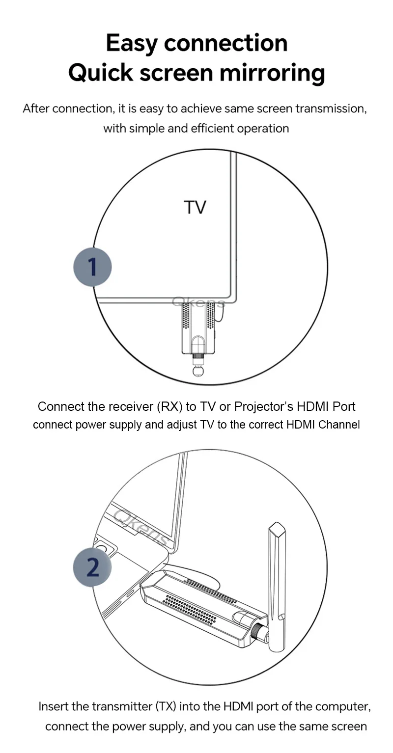 1.Transmisión de audio y vídeo HDMI a través del protocolo de transmisión inalámbrica incorporado, sin necesidad de wifi ni Internet 2.HDMI 1.1, compatible con HDCP1.2; 3.Admite resolución de vídeo HD normal 1920x1080@60Hz; 4.La transferencia es eficiente para garantizar que la reproducción fluya; 5.Sistema de equilibrio automático incorporado, la imagen es fluida, clara y estable; 6.El circuito de protección electrostática ESD incorporado, sistema integral de protección de seguridad; 7.Instalación simple y conveniente, plug and play, no es necesario configurarla.